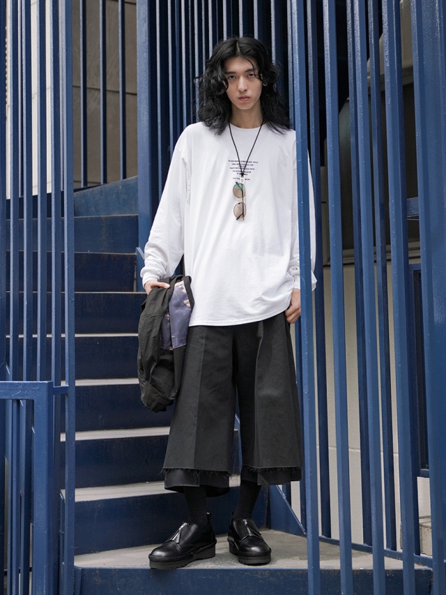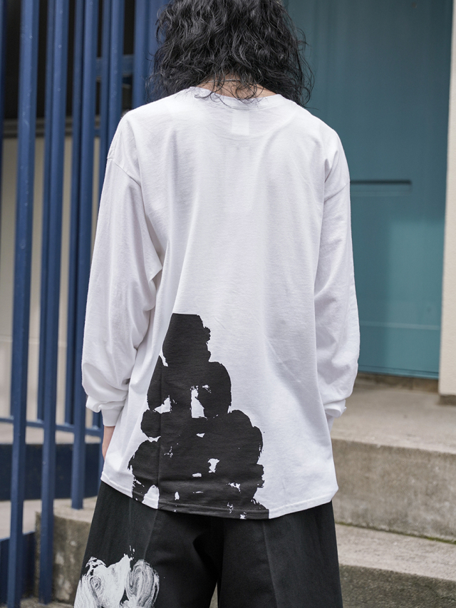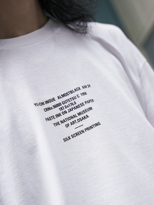 書家の井上有一氏の代表作でもある《愚徹》(1956年)の作品を後ろ身頃に大胆にのせたインパクトのあるカットソー。フロント中央には作品のクレジットをプリントし、コラボレーションを強く意識させるデザインに。
