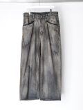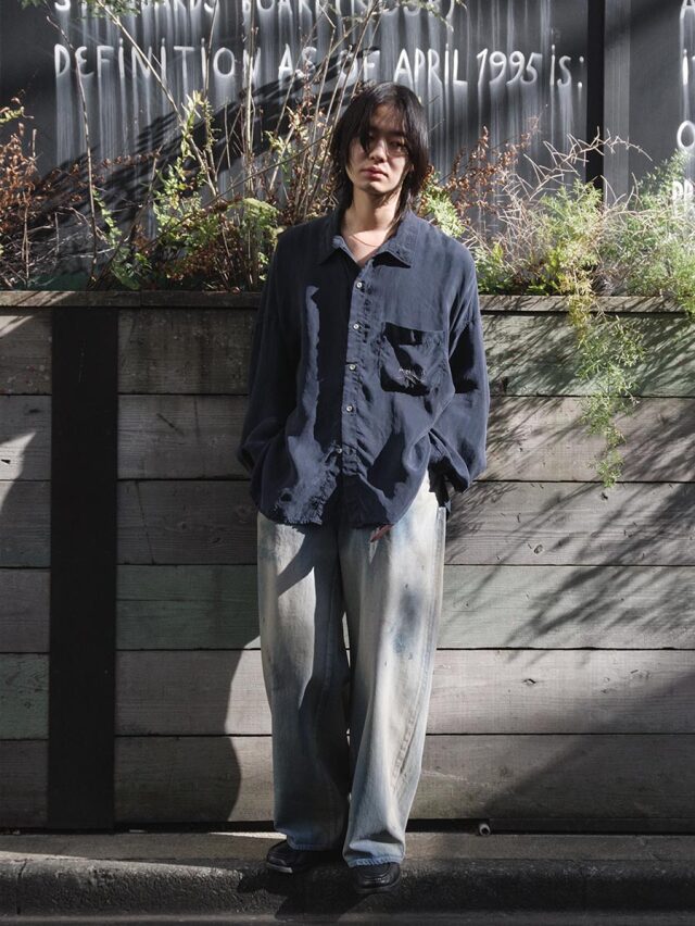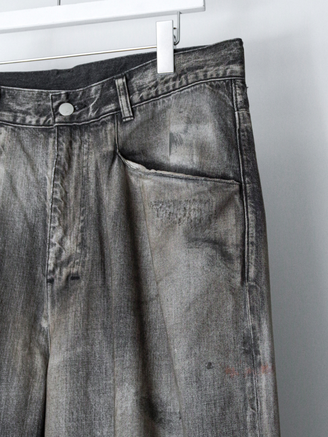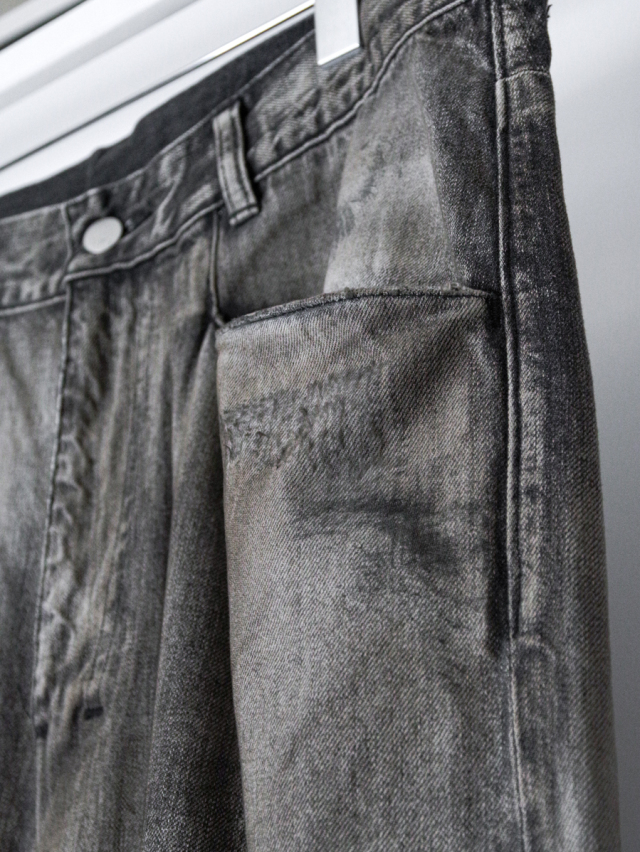 色味の強いデニムをベースに、手擦りによってフェードを生み出し、奥行きのあるグラデーションを形成。さらに小穴や小さな汚れに至るまで一つひとつバランスを見極めながら位置を定め、職人が一点一点手作業で仕上げることで、迫力あるコントラストを描き出しています。