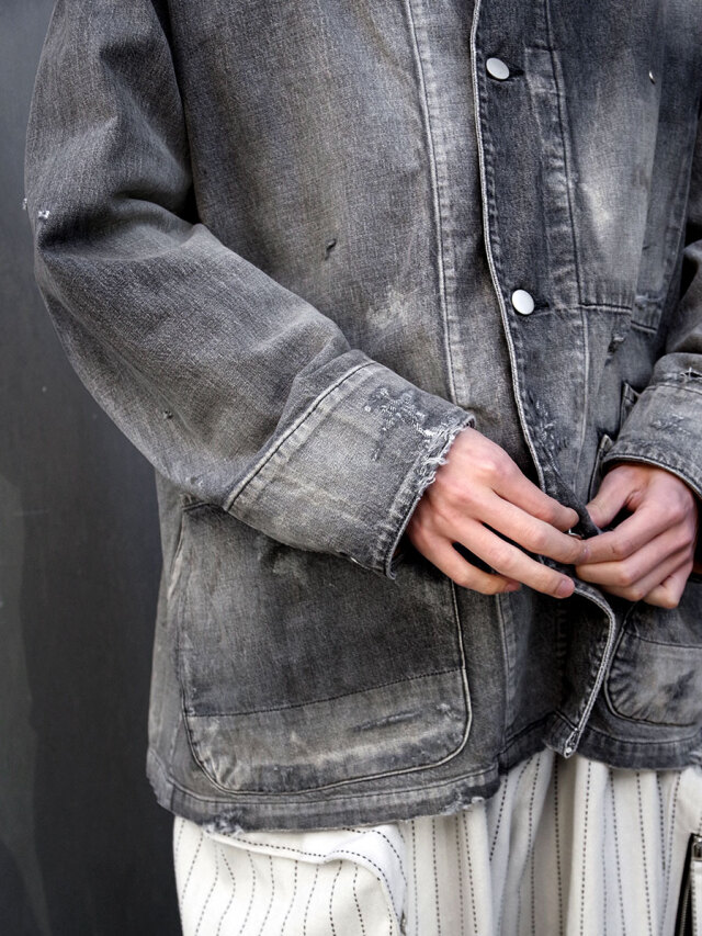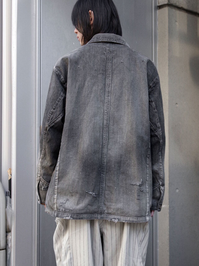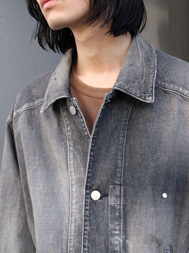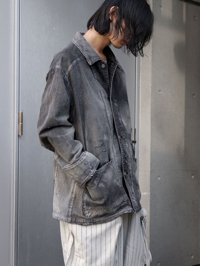 やや長めに設定した着丈が、パンツのポケットに手を入れた際に後ろへ流れる生地の量まで計算されており、動きの中で独特のムードを生み出します。