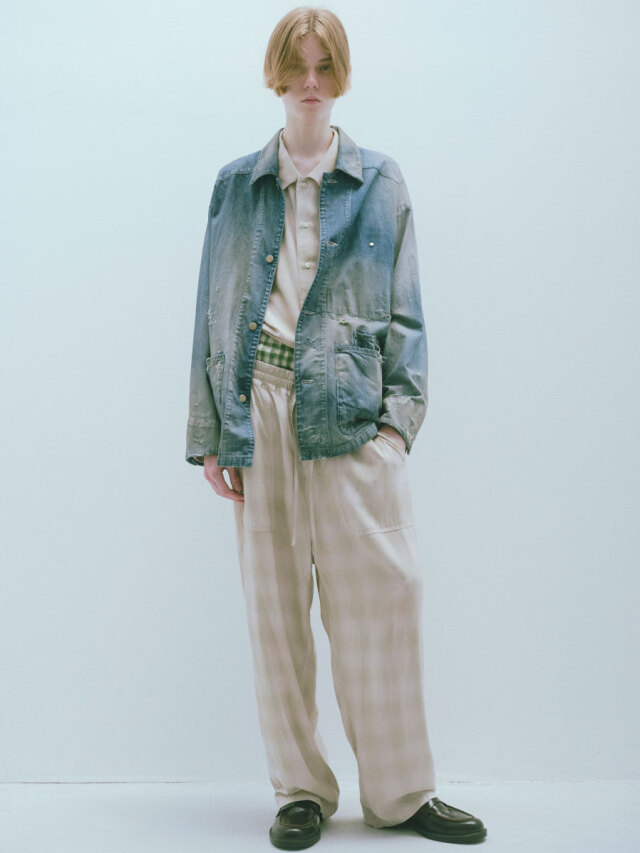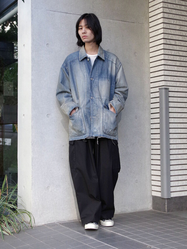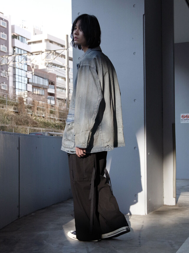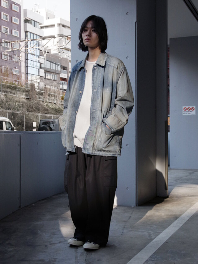 やや長めに設定した着丈が、パンツのポケットに手を入れた際に後ろへ流れる生地の量まで計算されており、動きの中で独特のムードを生み出します。