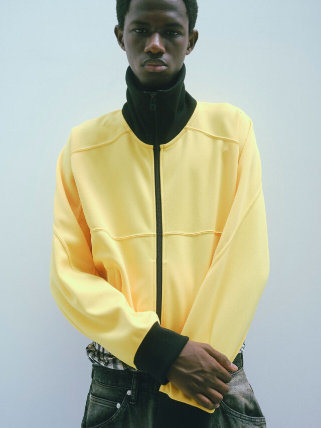 A high-neck track jacket that is simple yet captivating with details. In order to avoid a flat impression, the fabric is skillfully switched and constructed with a unique pattern. It is a minimalist piece with a shining design.