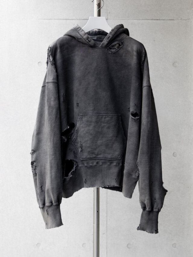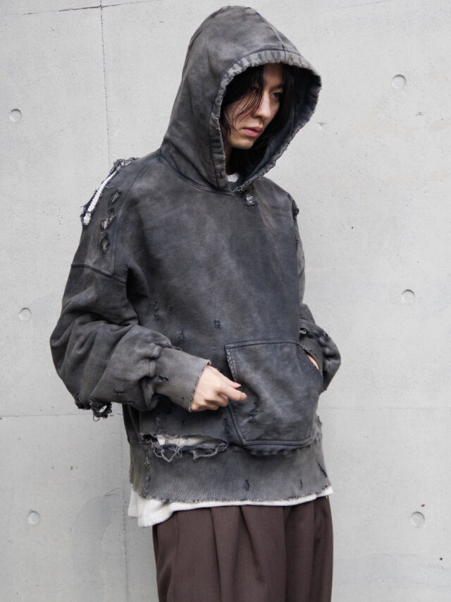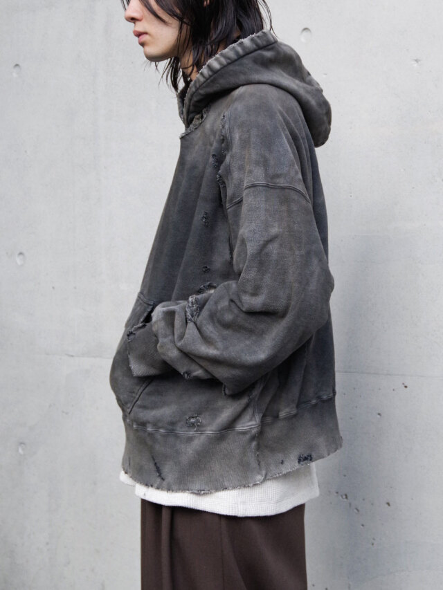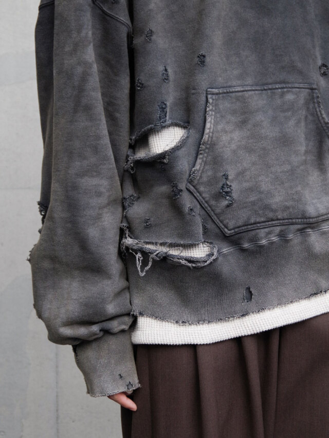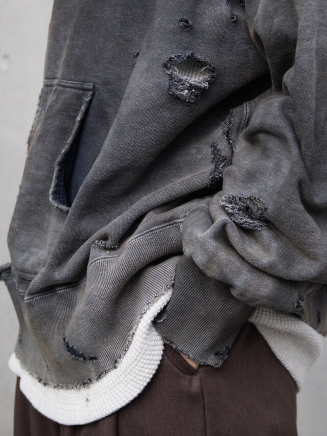 This product, which has been subjected to a crushing process that brings together ANCELLM's processing technology, uses a unique dyeing method to express three-dimensional light and shade on the fabric that is knitted from air-spun yarn. The falling effect creates beautiful shadows, and the gradation is multilayered. It is said that the aim was to create severe damage that does not even exist on second-hand clothing, and the design was carefully balanced by adjusting the depth in millimeter increments, as well as scraping the upper thread and leaving the bobbin thread.
