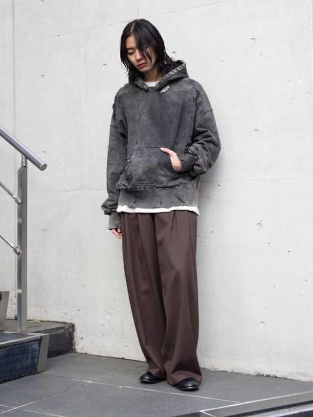 ANCELLMの加工技術を集約させた渾身のクラッシュ加工が施された本作は、空紡糸を編み立てた生地に、独自の染色で立体的な明暗と濃淡を表現。落ち感が美しい陰影を作り出し、グラデーションを幾重にも広げています。激しいダメージは古着にもないものを目指したとされ、ミリ単位で深さを調整しつつ、上糸を削り下糸を残すなど緻密なバランスで設計されています。
