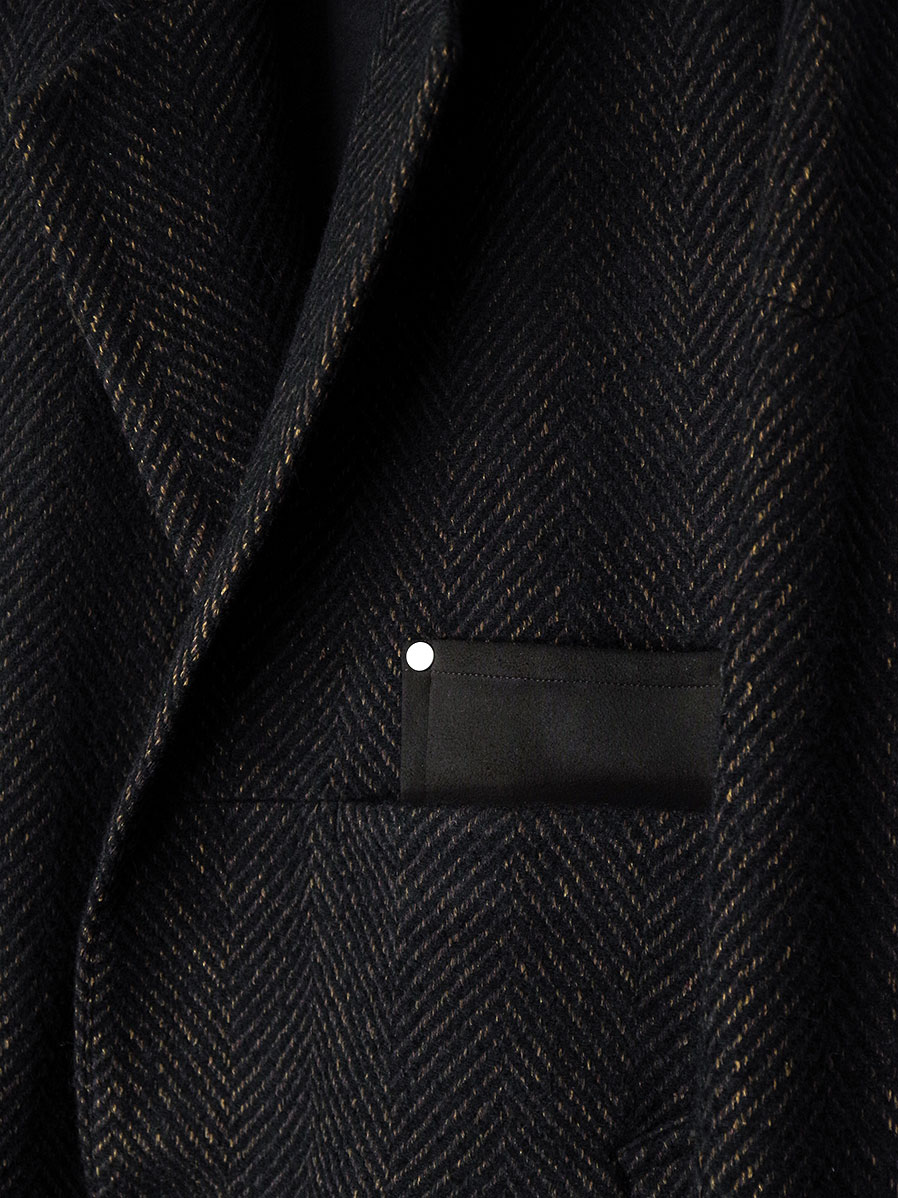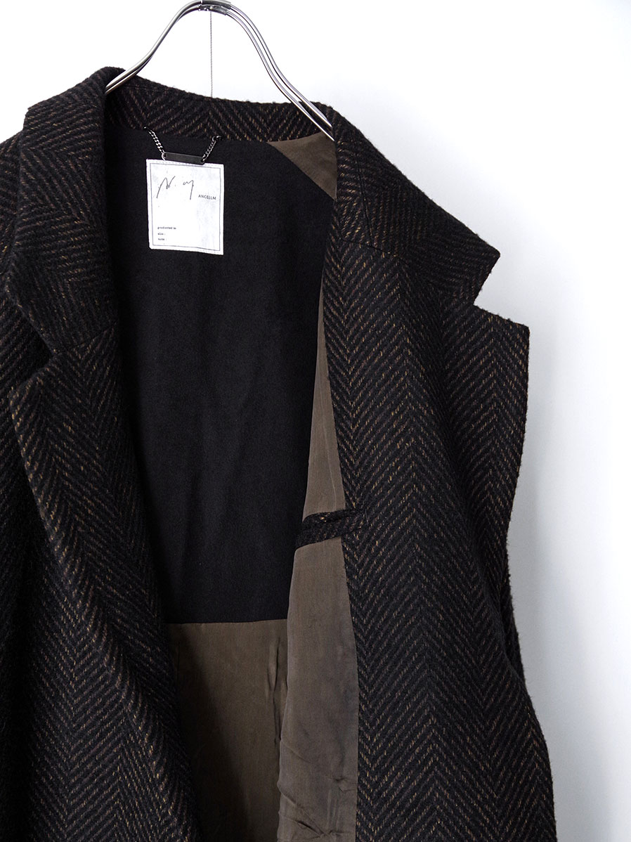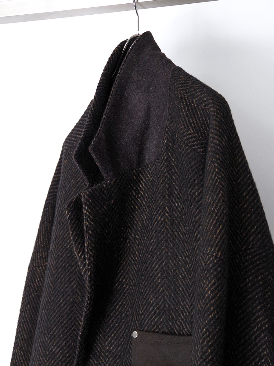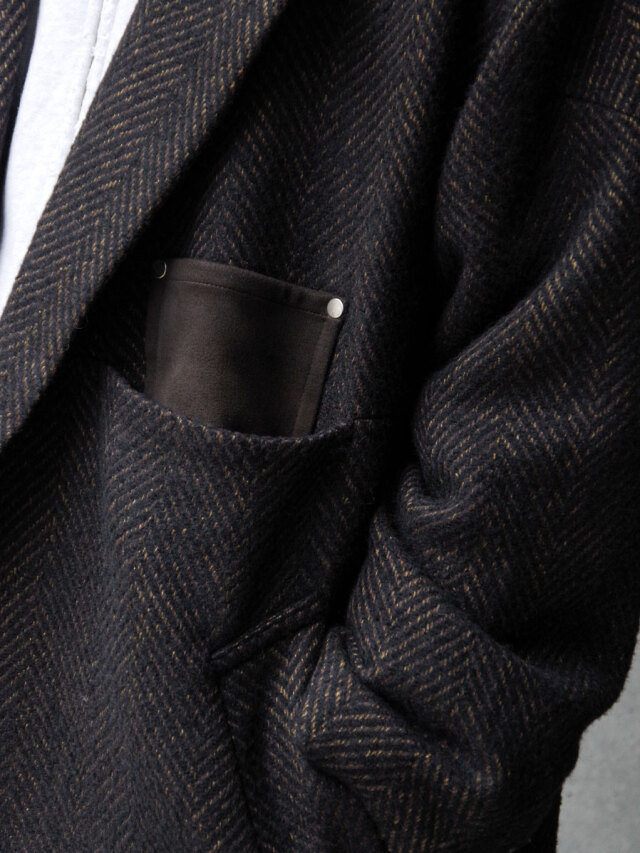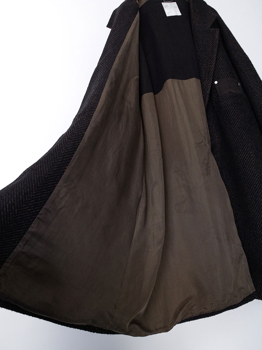A long coat crafted from original herringbone fabric, designed with a relaxed A-line silhouette that sways elegantly with movement.