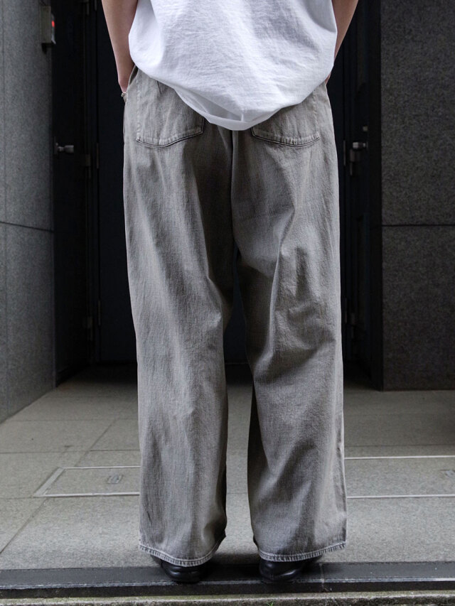 ライトオンスならではの落ち感が生む豊かなドレープが魅力で、シューズの上でクッションさせたり、裾を引きずるようなルーズなスタイリングもおすすめ。さらに、ウエストをベルトで絞ったときの陰影や立体感にも注目です。