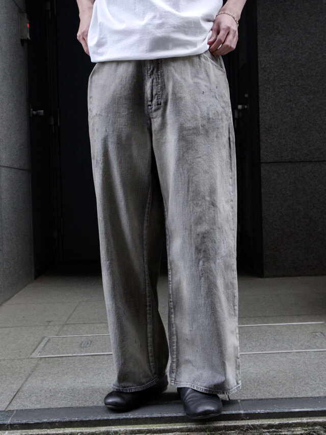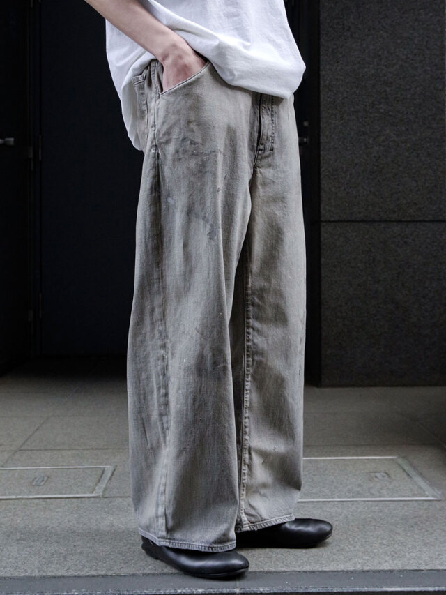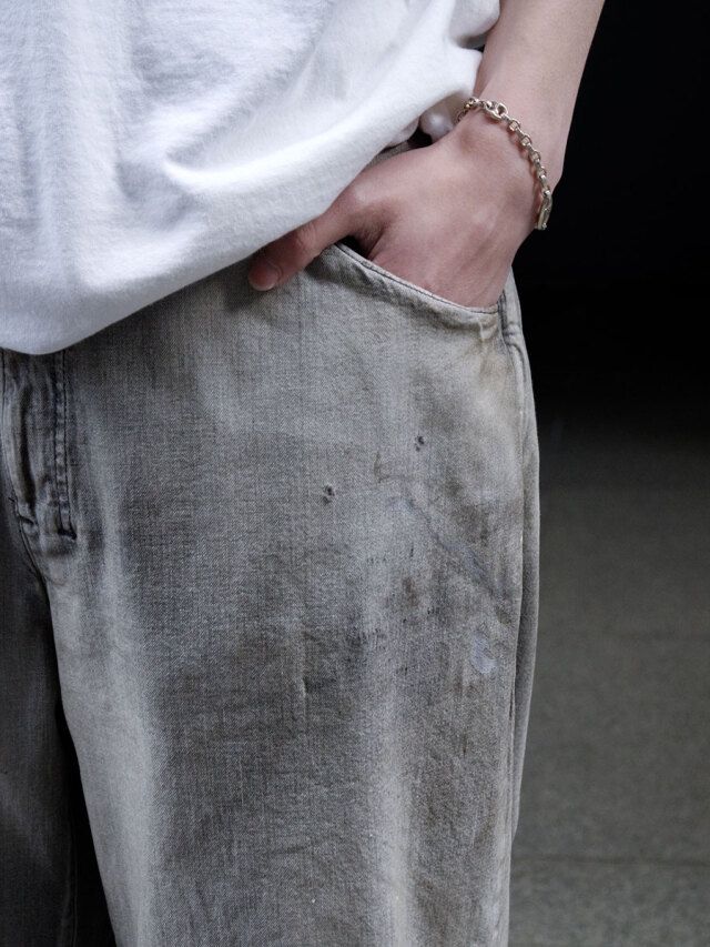 その上に、ペンキや汚し加工を重ねることで、古着にはない奥行きと現代的ムードを融合させた、唯一無二の表情を実現しました。