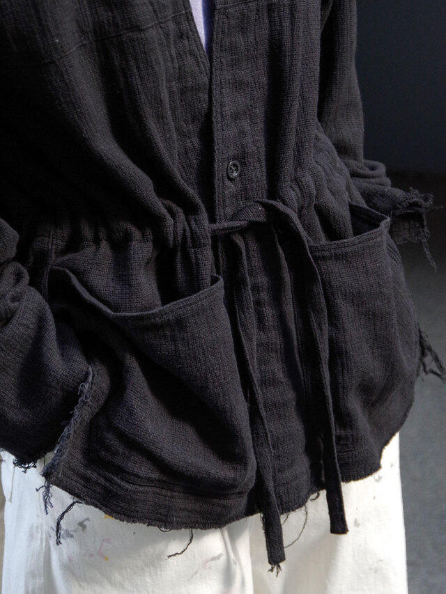 The hem and cuffs are finished with raw cuts, and the hanging threads create a rough and moody look. In addition, by pulling the drawstring at the hem, drapes and shadows are created, highlighting the beauty of the movement.