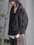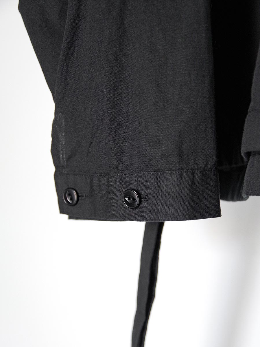 広く取られた身幅と、オリエンタルなニュアンスを感じさせるボリュームのある袖が特徴。両胸には大きめのポケットを配し、裾の共布テープや袖口のボタンによってシルエットのアレンジも可能です。