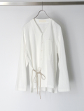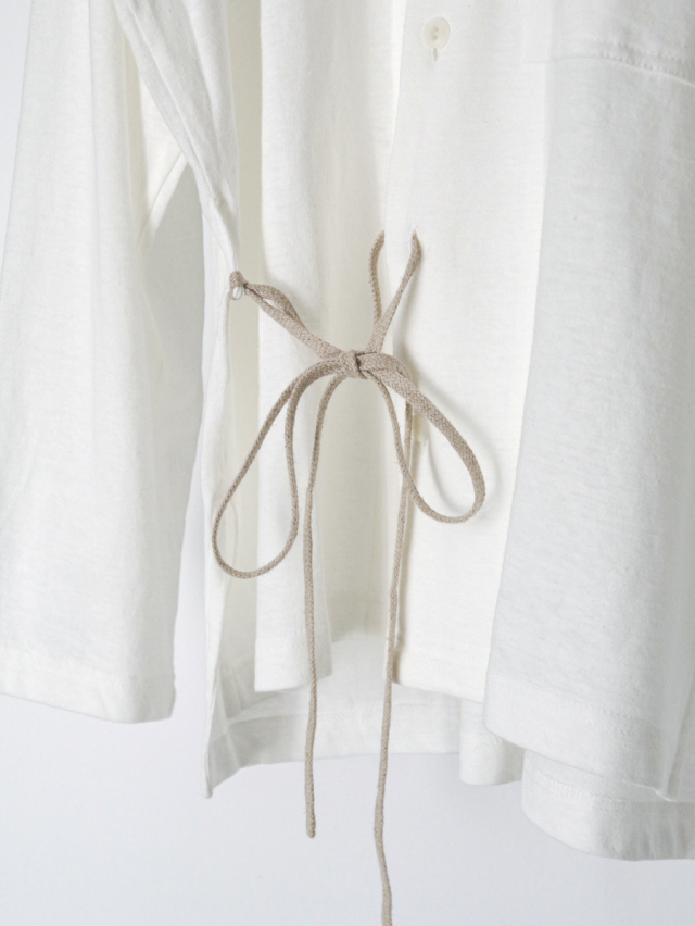 シルエットは程よくゆとりを持たせたリラックスフィット。オリエンタルな空気感を漂わせるVネックデザインにより、一枚でさらっと羽織る着こなしから、サイドに配されたテープを留めた和のニュアンスを感じるスタイルまで、幅広いアレンジが可能です。
