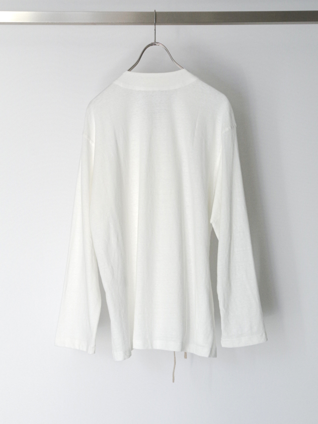 The silhouette features a relaxed fit with moderate volume. The V-neck design carries an oriental nuance, allowing it to be worn lightly as a layer or styled with a Japanese-inspired look by fastening the side tapes. It also works well as an inner layer under jackets, creating depth through layering around the neckline.