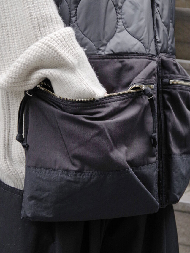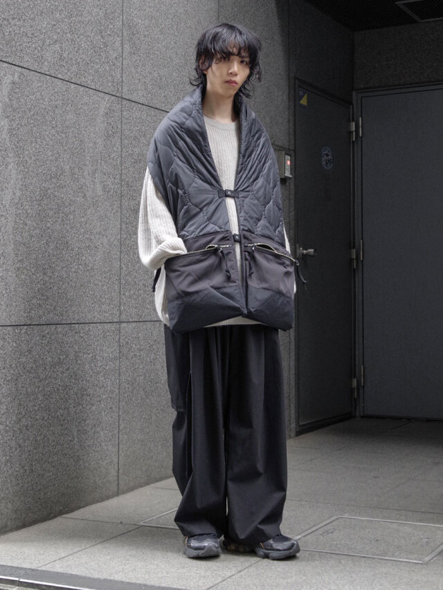 Worn draped like a shawl around the neck, it features a zip pocket positioned at the waist for storing small essentials, while hand-warmer pockets on the reverse side keep your hands cozy on cold days.