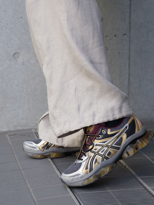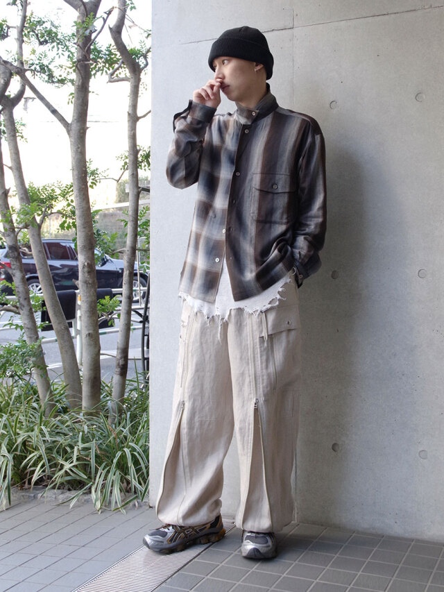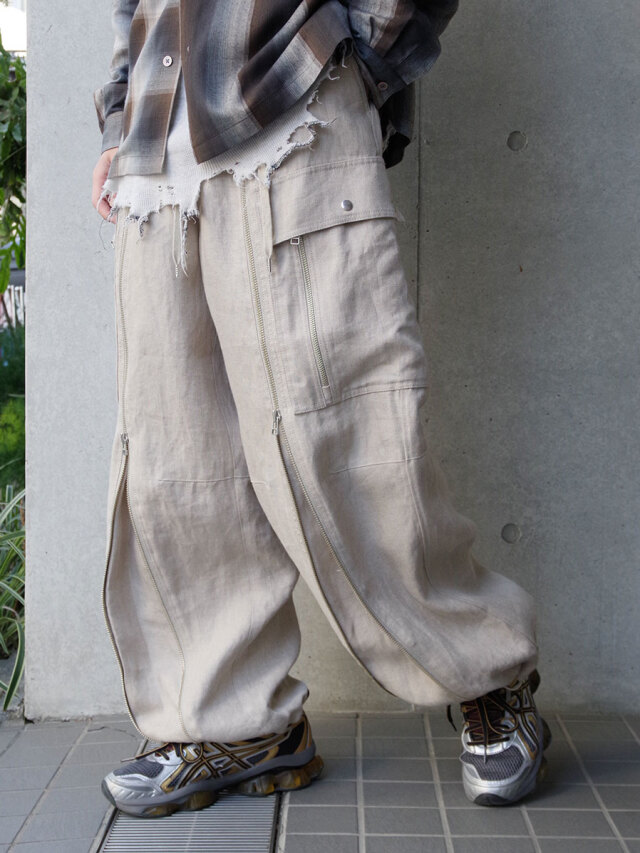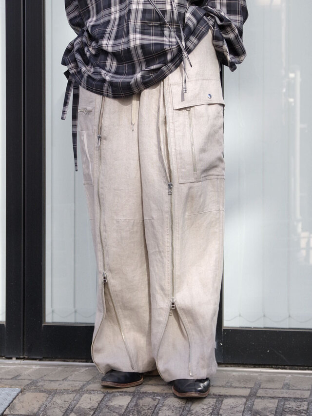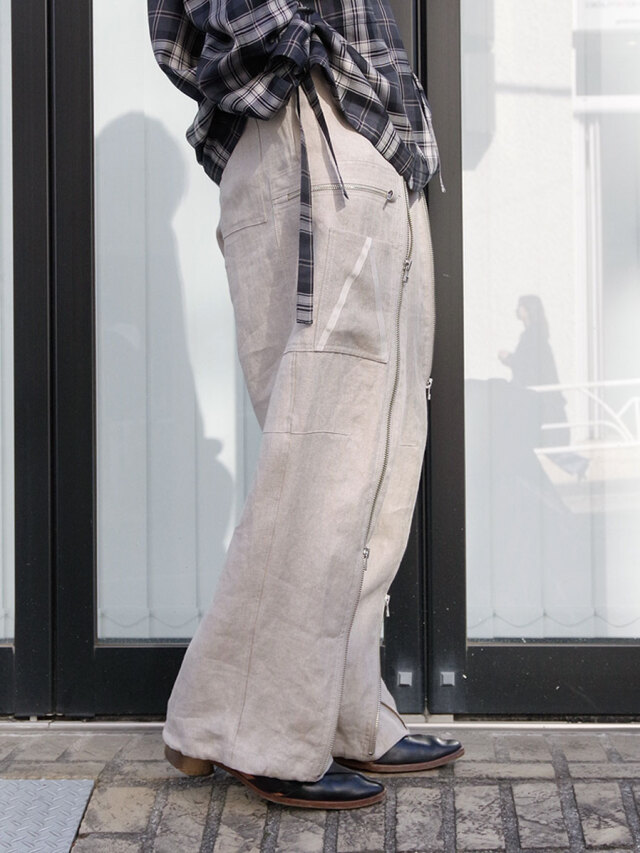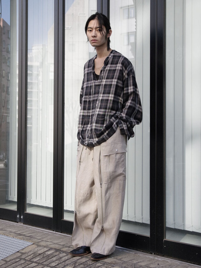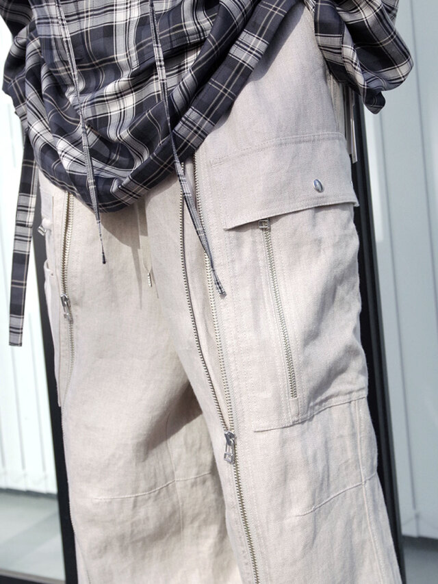 Opening the zipper running vertically on the front exposes the gusset from below, allowing you to adjust the silhouette. There is also a spindle on the back of the hem, so you can tighten it as needed and enjoy styling to your liking.