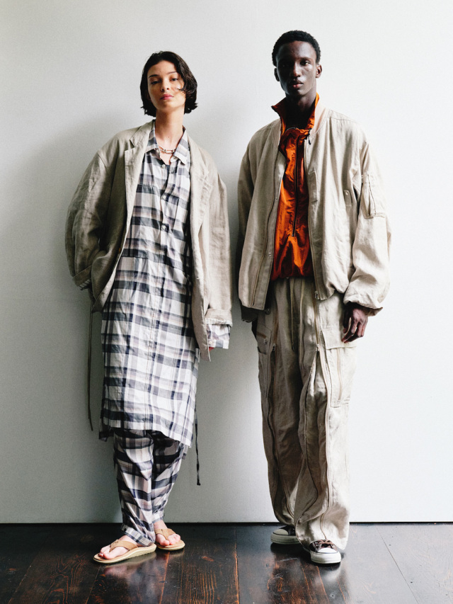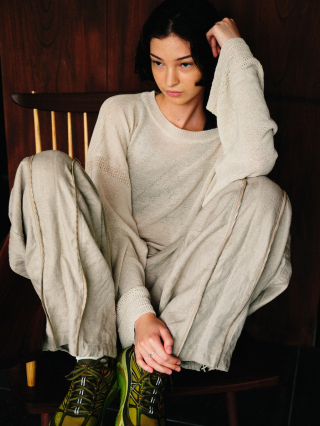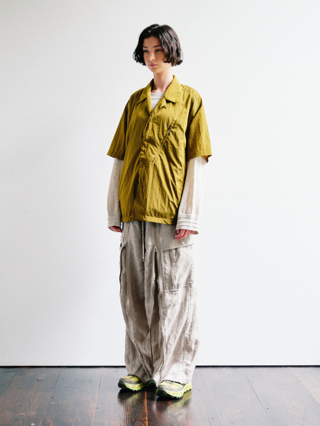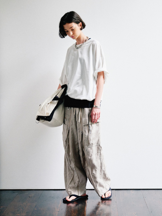 The shape is a wide silhouette with plenty of room. The three-dimensional structure is created through precise pattern making. The material has a natural texture and subtle luster unique to linen. The accessories are the same color, giving the hard details an elegant look.