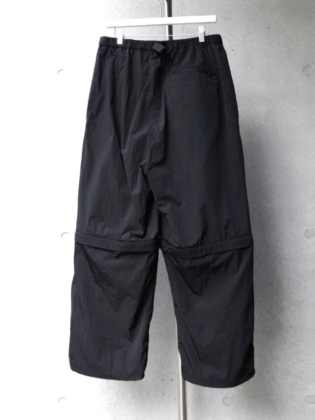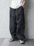 Wide pants with outstanding functionality that can be enjoyed in 2 ways depending on the scene. The part below the knee can be removed with a zipper, and the design can be worn as shorts. Although the silhouette is powerful and super wide, all the accessories are unified in black, giving it a solid impression.