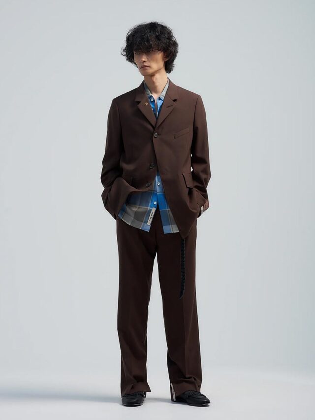 A floral lining is layered on the inside, designed to appear and disappear through deep side slits as the garment moves. The ultra-light wool-based check fabric has a subtle sheerness, allowing the floral pattern beneath to softly emerge, creating a sense of depth and visual intrigue.