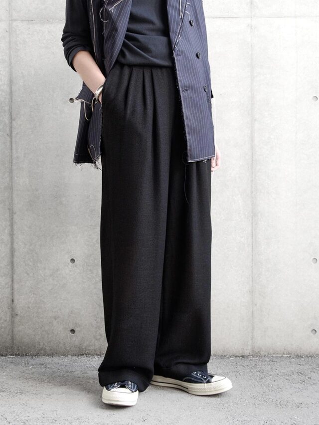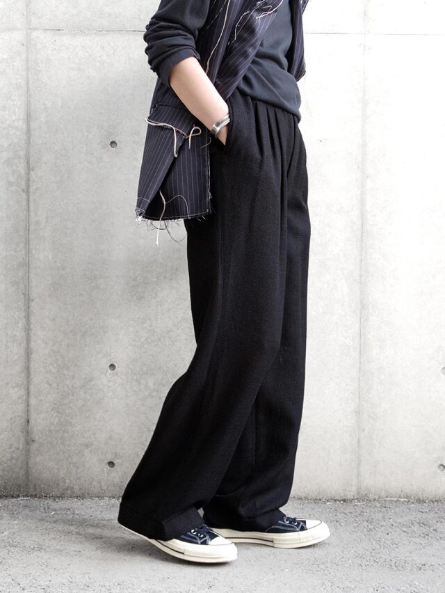 腰回りには3タックを施し、自然な膨らみを持たせたリラックスシルエットに。裾はダブル仕様で、カジュアルな穿き心地の中にも上品さを感じさせる仕上がりです。