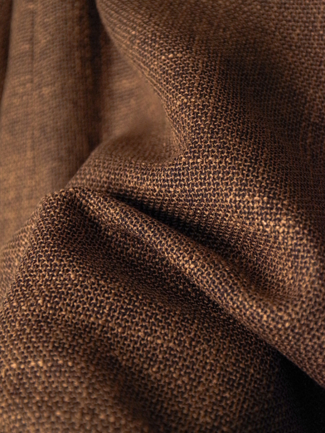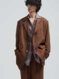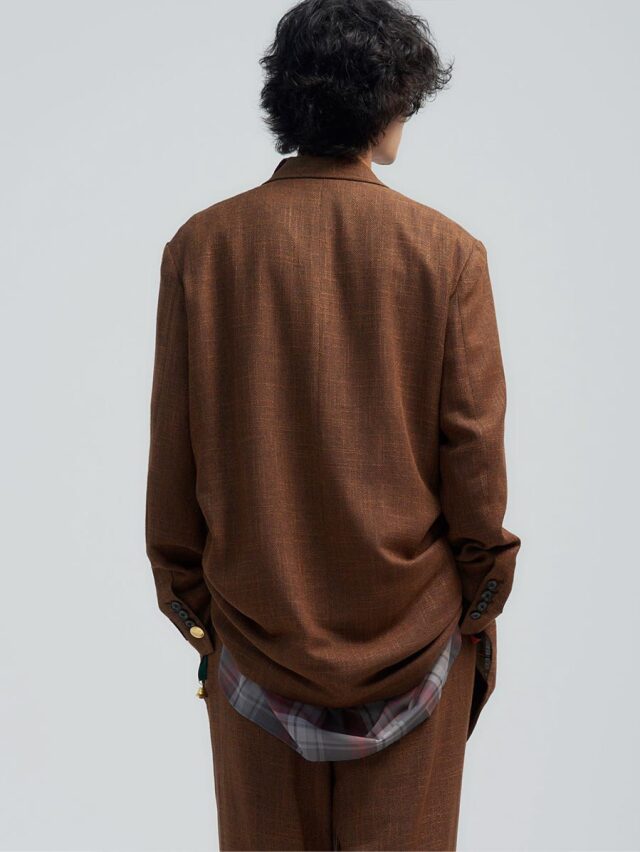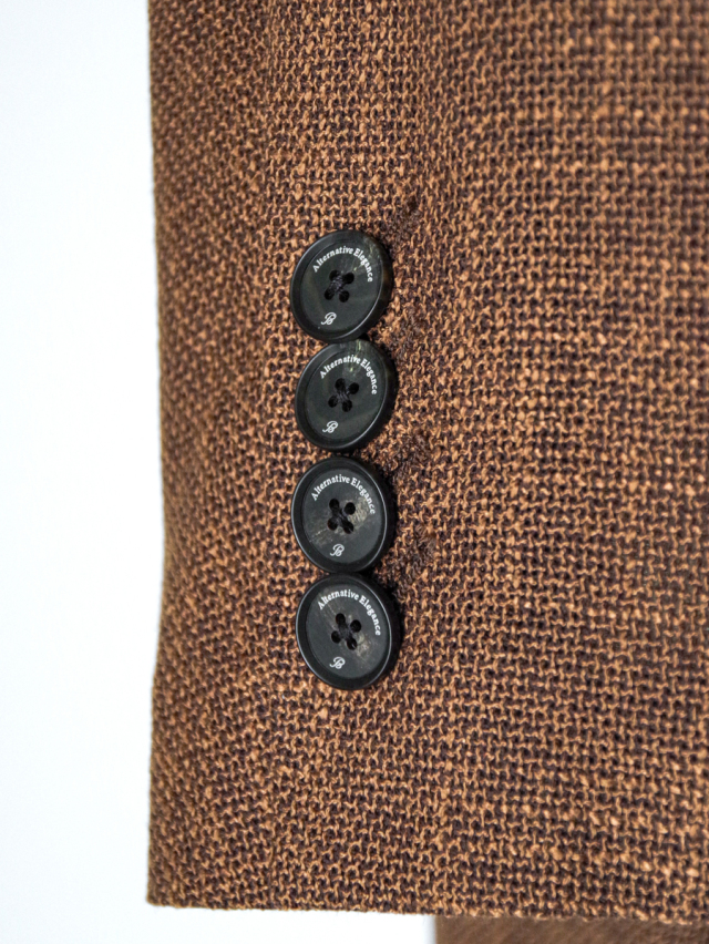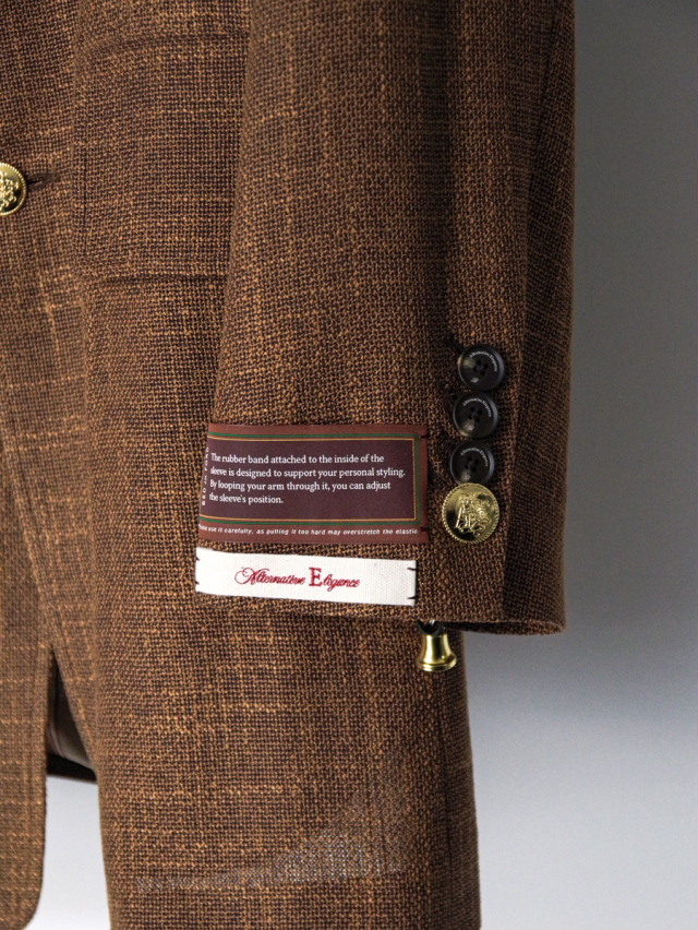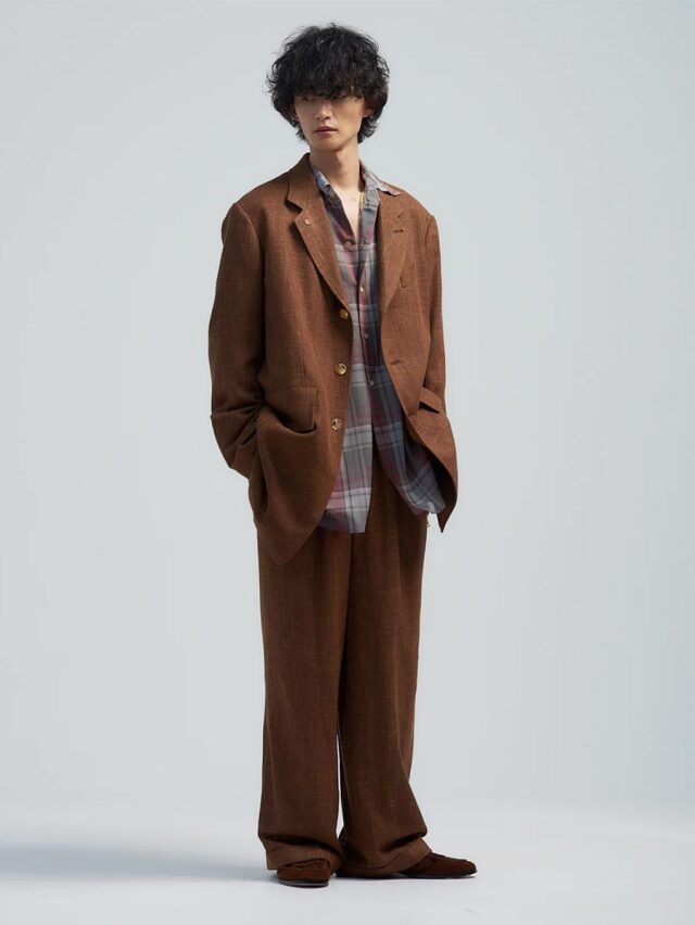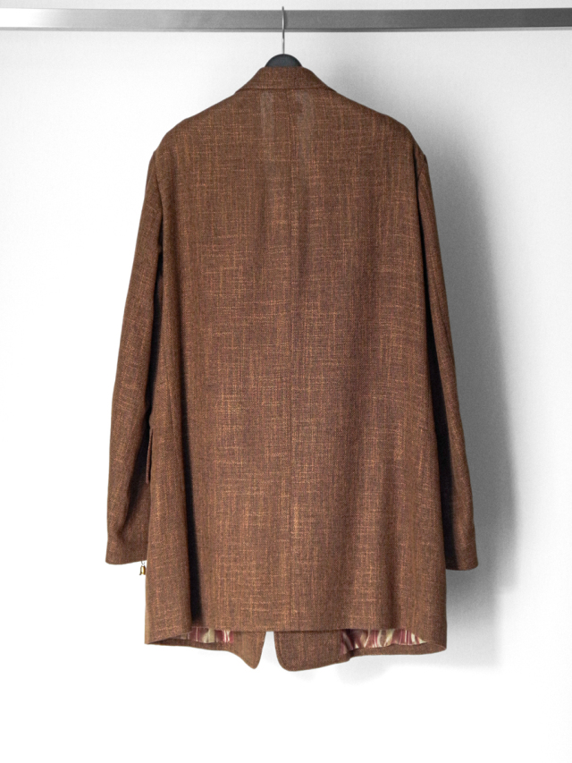 Designed as a mid-length single-breasted jacket, it uses a breathable summer tweed fabric with a subtle sheerness. The material is woven from Australian merino worsted yarn and rayon slub ring yarn, creating a lightweight texture with depth and character. The lining features a striped sheer fabric that enhances the airy impression. Original concho buttons add a distinctive detail, with gold for the brown version and silver for the black.