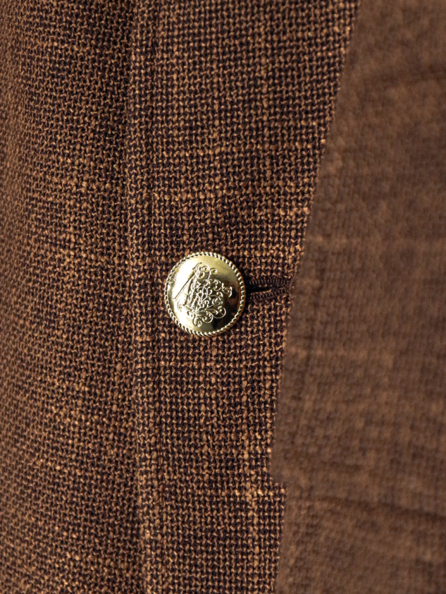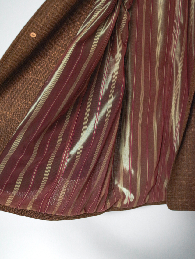 ミドル丈のシングルブレスト仕様で、素材にはやや透け感のある通気性豊かなサマーツイードを採用しています。生地はオーストラリア産メリノ種の梳毛糸と、レーヨンのスラブリング糸を交織したサマーツイードで、軽やかさと奥行きのある表情を兼ね備えています。裏地にはストライプ柄のシアー素材を用い、軽快な印象に。さらにブラウンにはゴールド、ブラックにはシルバーのオリジナルコンチョボタンを配し、ディテールにも存在感を持たせています。