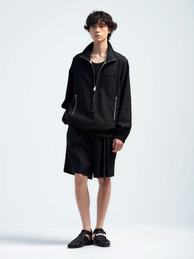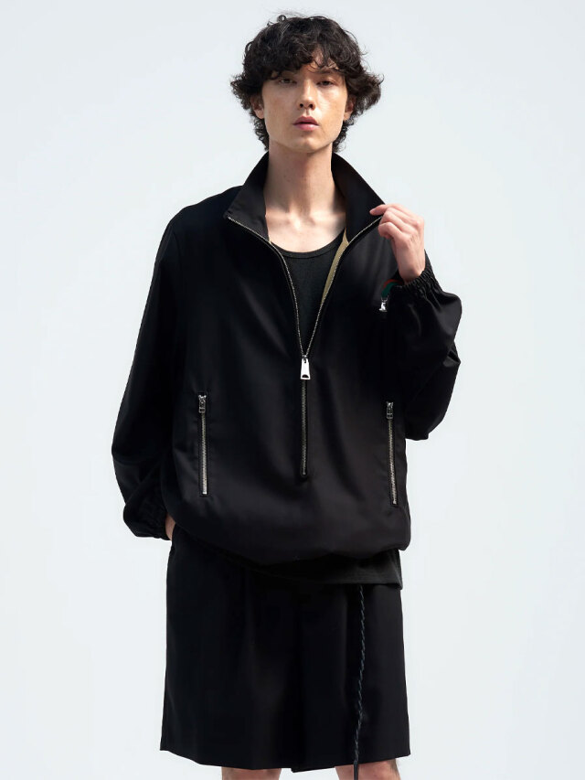 A pullover high-neck blouson defined by its elongated front zipper.