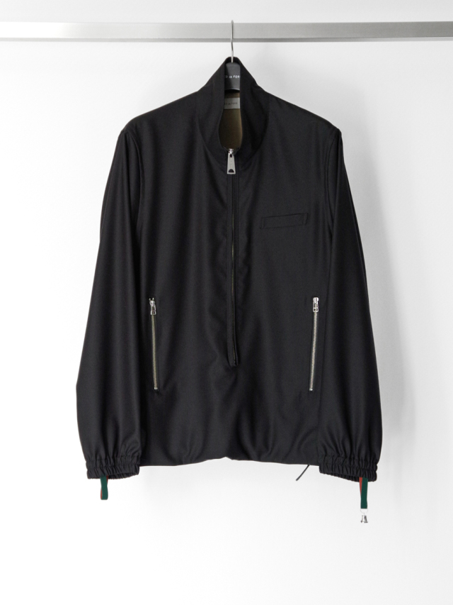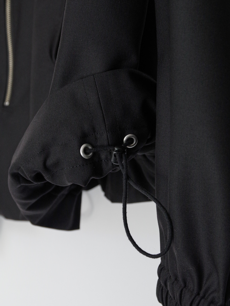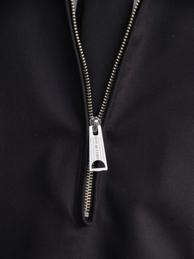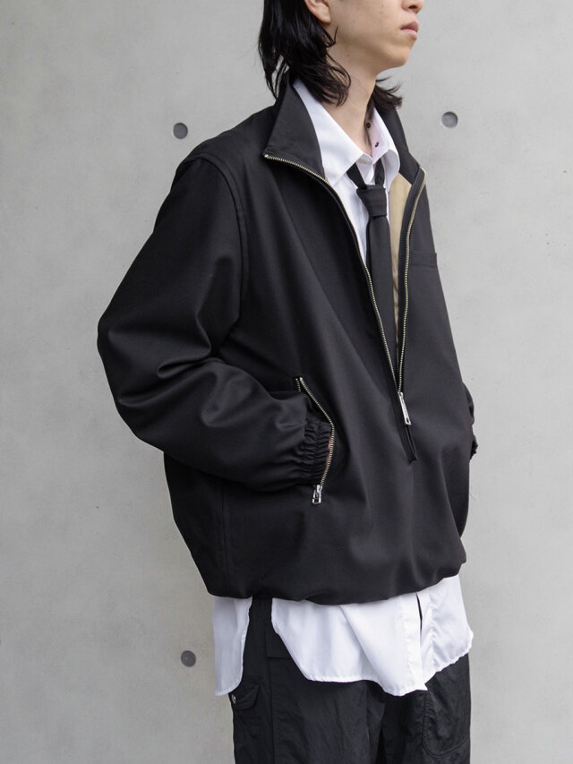 長めに配されたフロントファスナーが印象的な、プルオーバータイプのハイネックブルゾン。