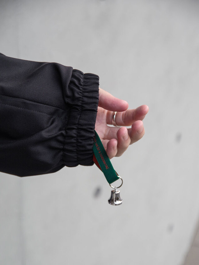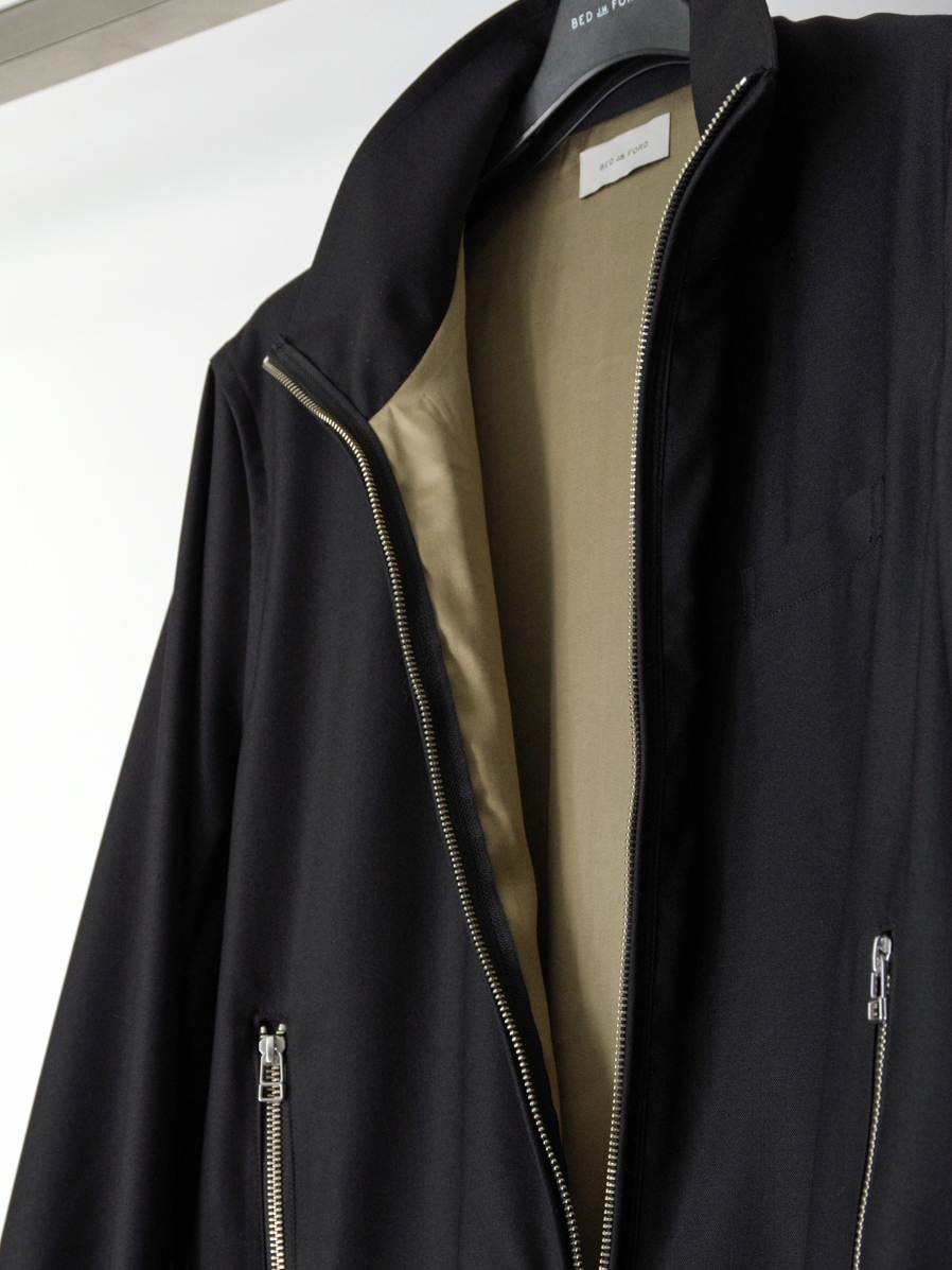 縦に走るジップラインが全体を引き締め、ミニマルなデザインの中にさりげない存在感を生み出しています。引き手にはブランドロゴを刻印したオリジナルパーツを採用。