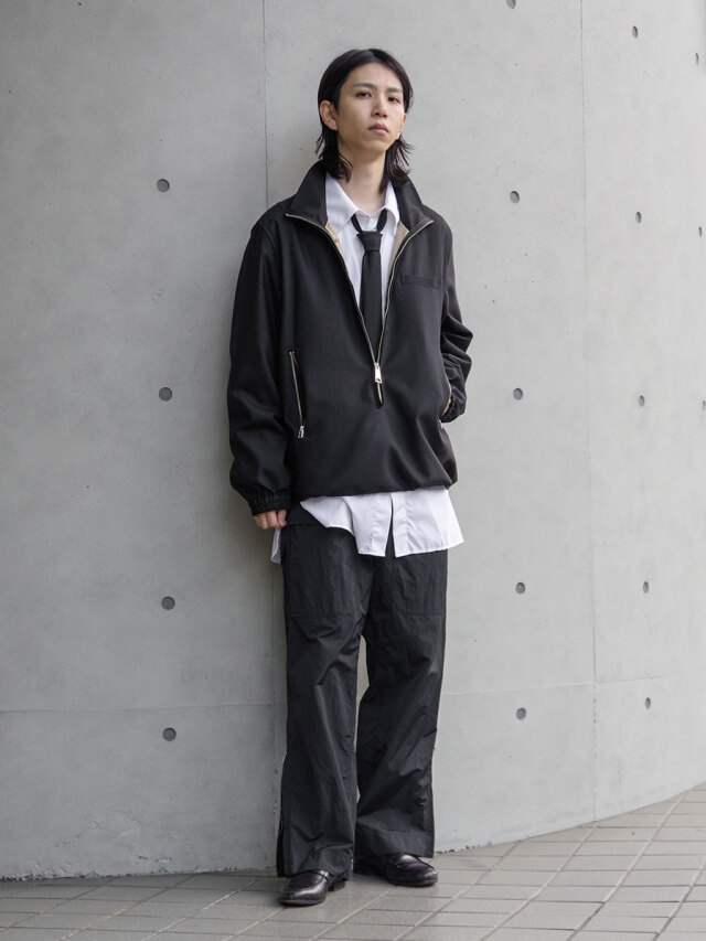 ファスナーの開閉によって、首元の表情やインナーとのレイヤードバランスを調整可能。