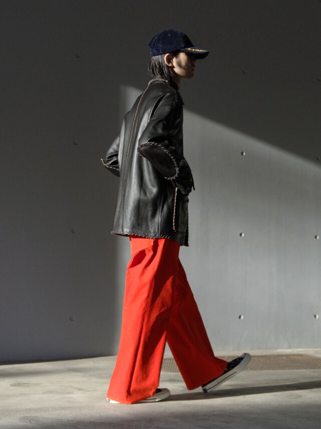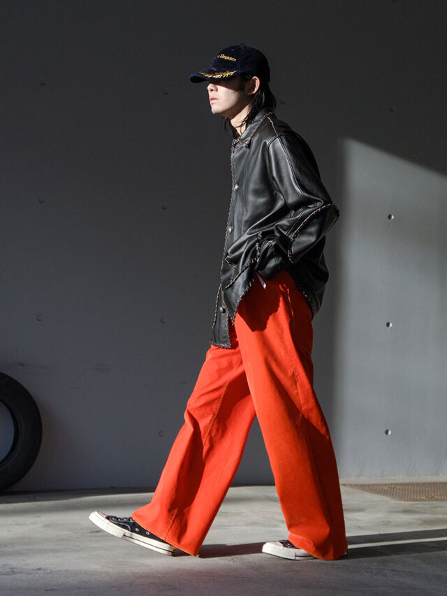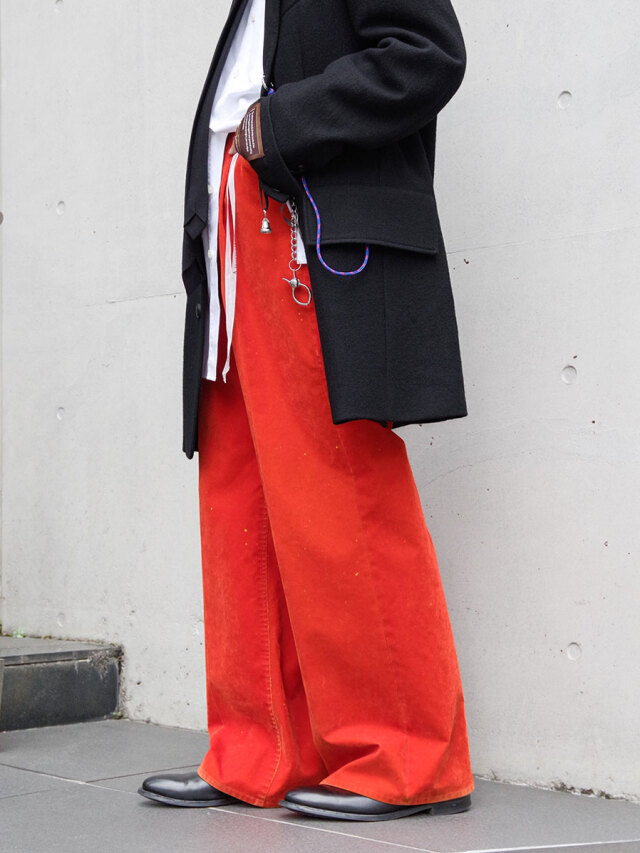 起毛感のある素材は、秋冬の季節感を演出するスタイリングにぴったり。クラシックな5ポケットの形をベースにしながらも、フロッキー加工と経年変化を前提とした仕掛けによって、他にはない奥行きを与えています。