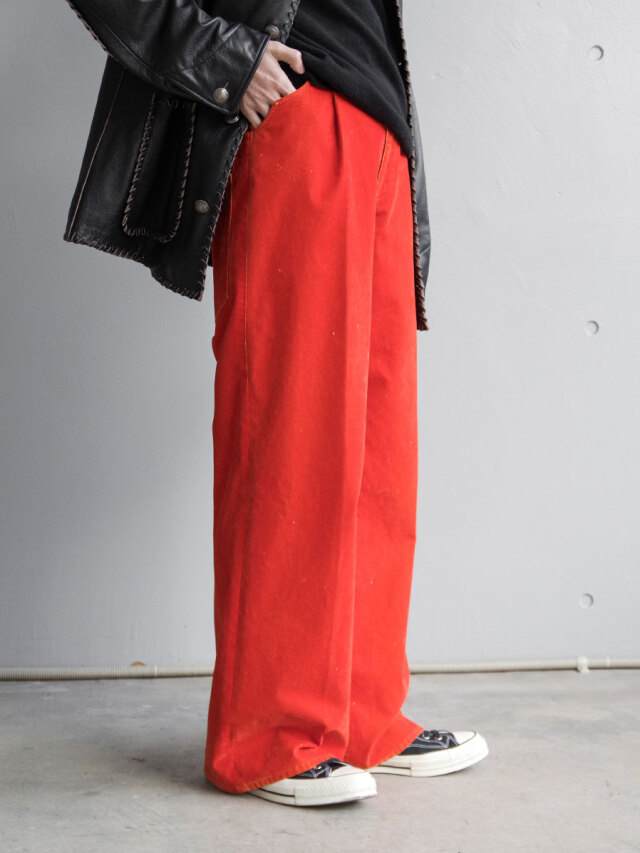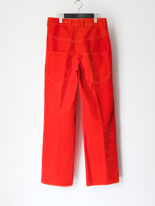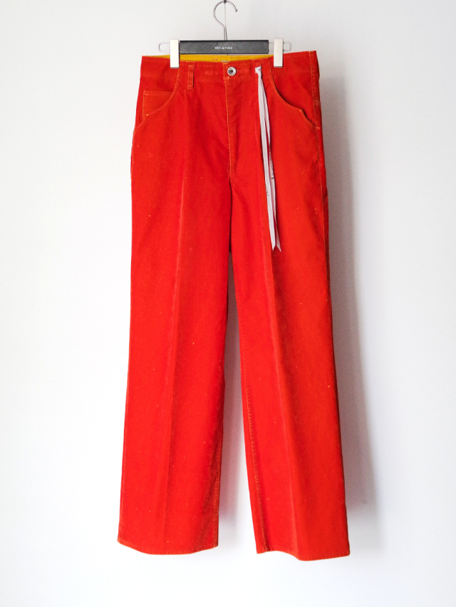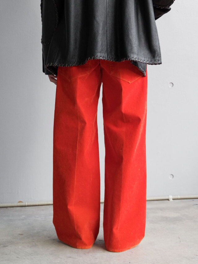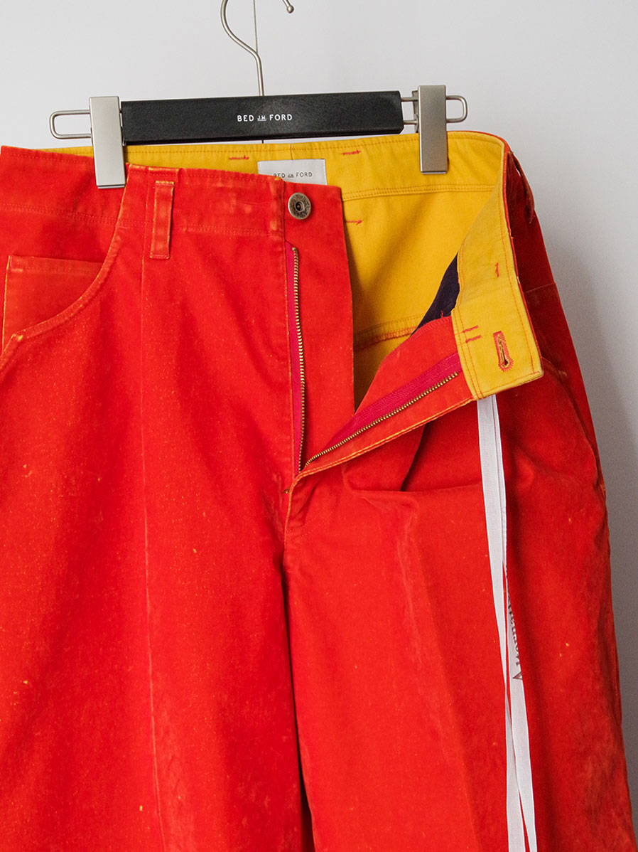 ベースにはコットンツイル生地を採用し、その表面にレーヨンのフロッキー加工を施しています。加工の段階であえて部分的にフロッキーを剥がすことで、まるで長年穿き込まれたようなヴィンテージ感のある独特の風合いを表現。さらに、地の色とフロッキーの色を切り替えることで、着用を重ねた際に表面が自然に剥がれ、下地の色が浮かび上がる経年変化を楽しめる仕上がりです。