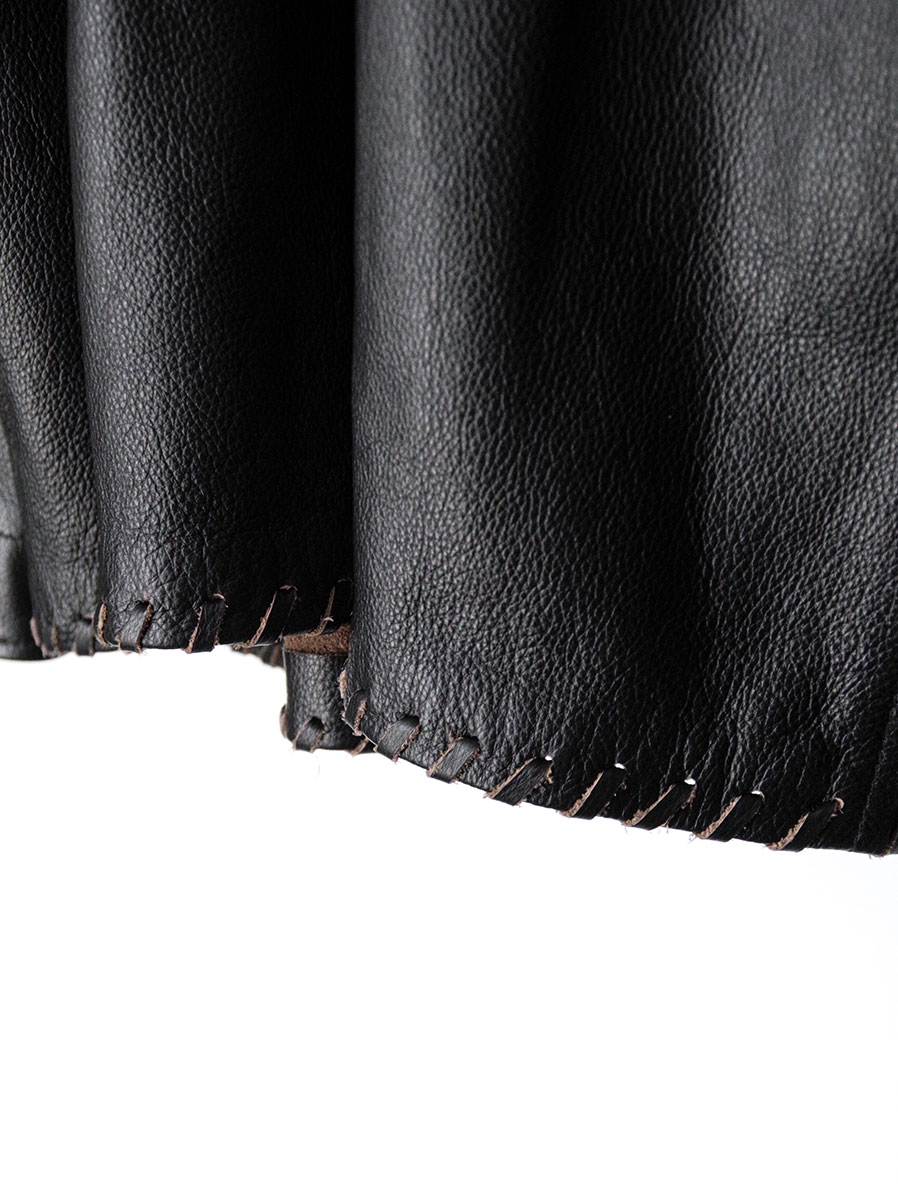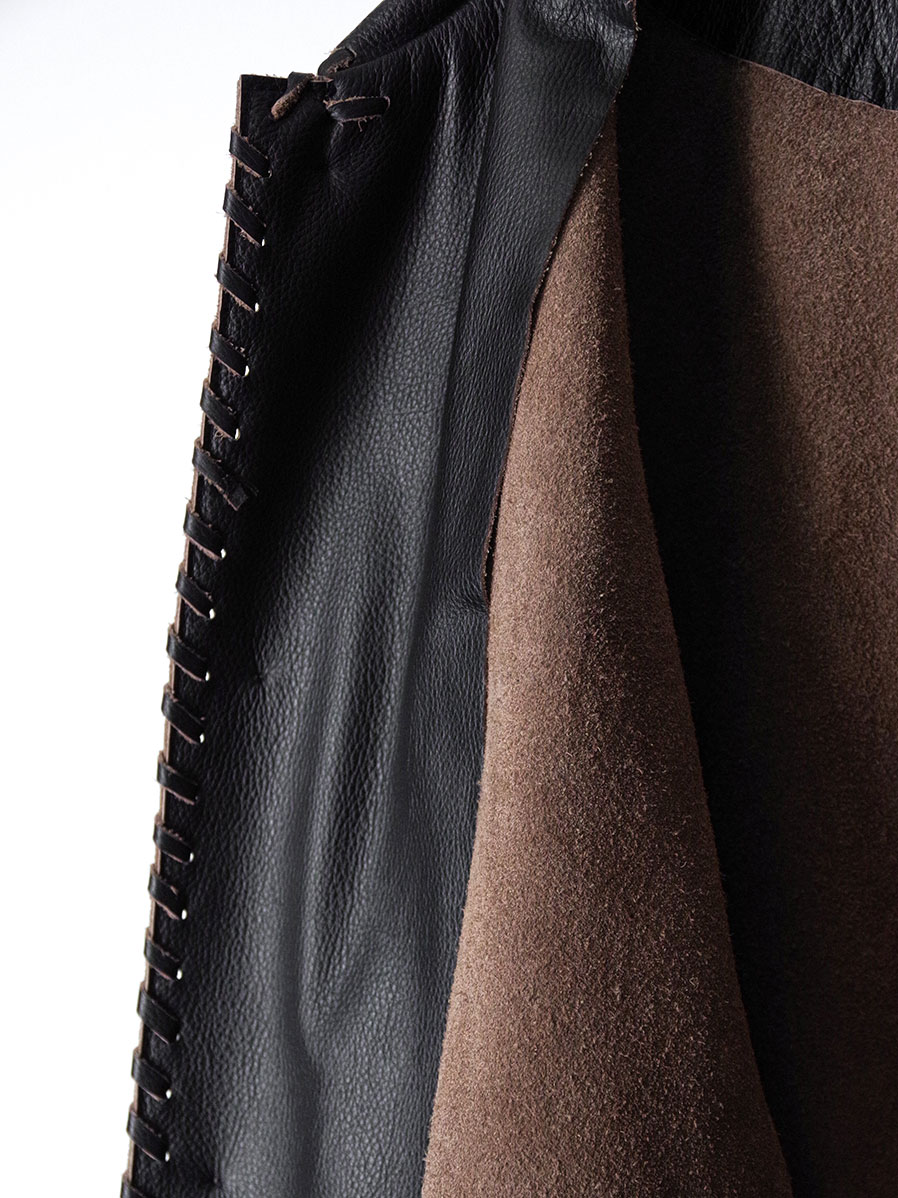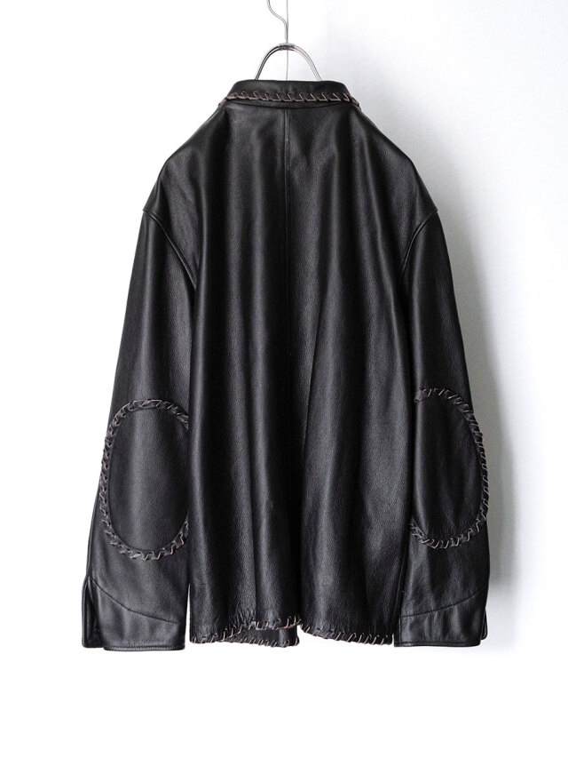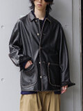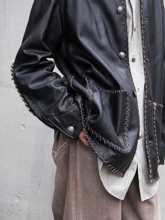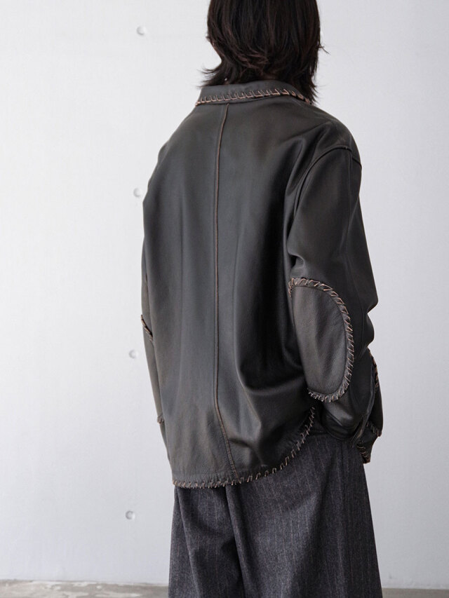 革端に平テープ状のレザーを巻き付けたカバーオール型ジャケット。どこかオールドな空気感を纏い、強い存在感を放つ一着です。