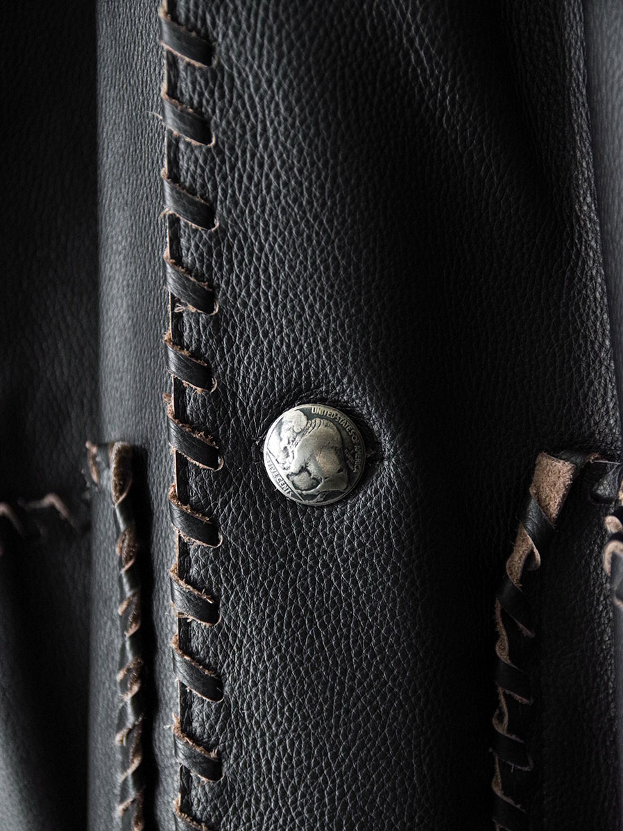 1900年代初頭の米セントコインを打ち出して仕立てたコンチョボタンをアクセントに、肘当て・ポケット・レザーテープワークといったディテールが光ります。無骨さと丁寧な仕立てが共存し、アメリカン・ヴィンテージを想起させる仕上がりとなっています。