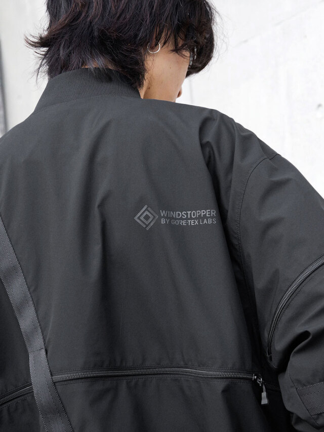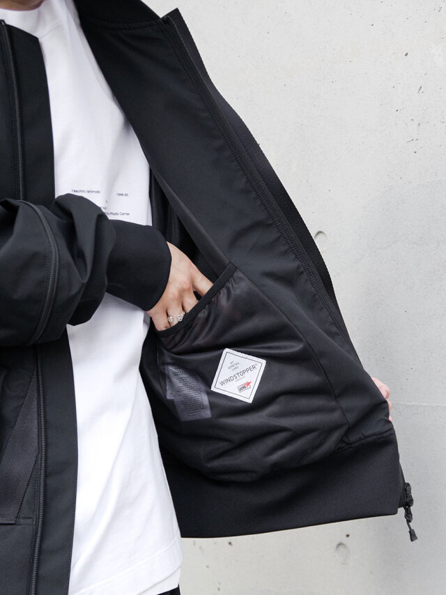 素材には WINDSTOPPER BY GORE-TEX LABS を採用し、高い撥水性・透湿性・防風性を兼ね備えています。外気を遮断しながら内側の熱を守るため、都市での雨やアクティブなシーンでも快適に着用可能です。