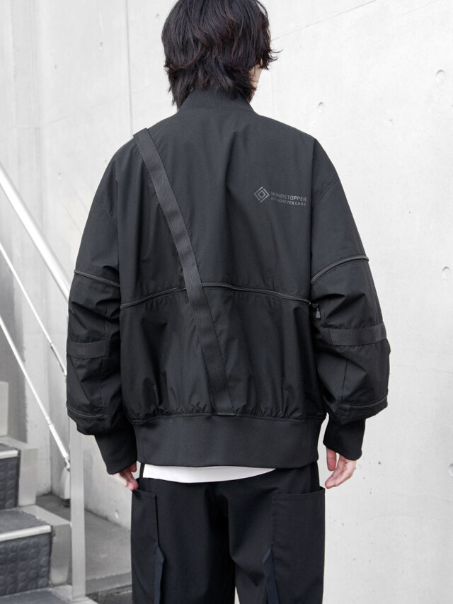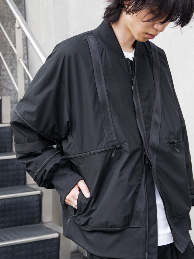 米軍アウターに見られる補強テープのディテールをデザインに落とし込み、ファスナーとの組み合わせによって機能性と存在感を両立させています。シルエットは着丈・身幅ともにやや細めに調整され、立体的なアームラインが可動域を確保。