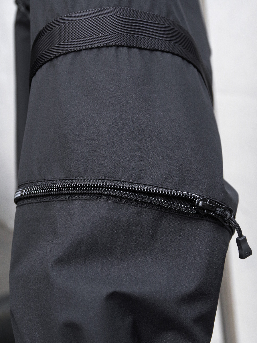 Military-inspired reinforcement tape is reinterpreted as a design element, paired with bold zipper placements for both function and style. The fit is slightly refined, with articulated sleeves ensuring unrestricted mobility.