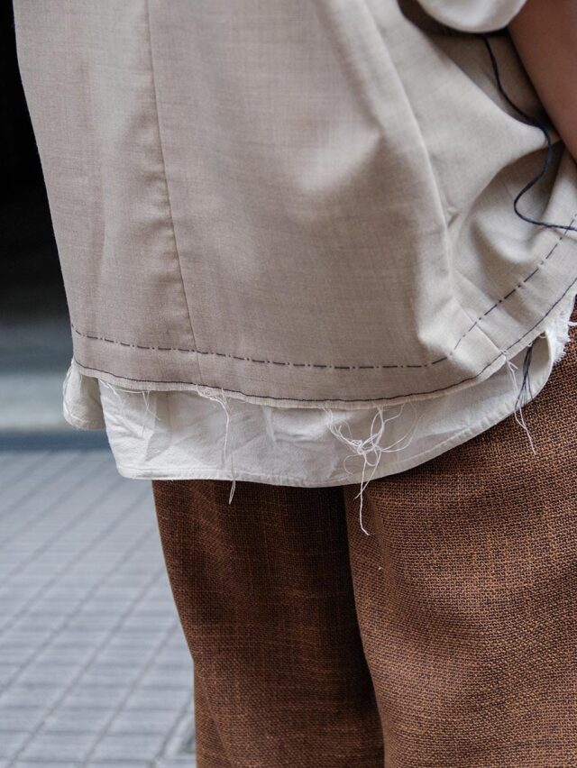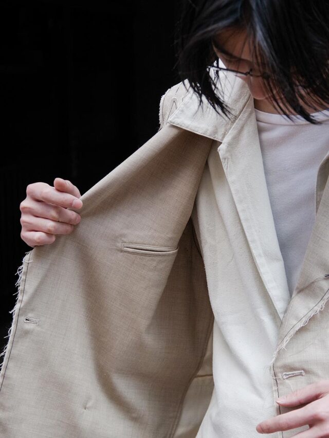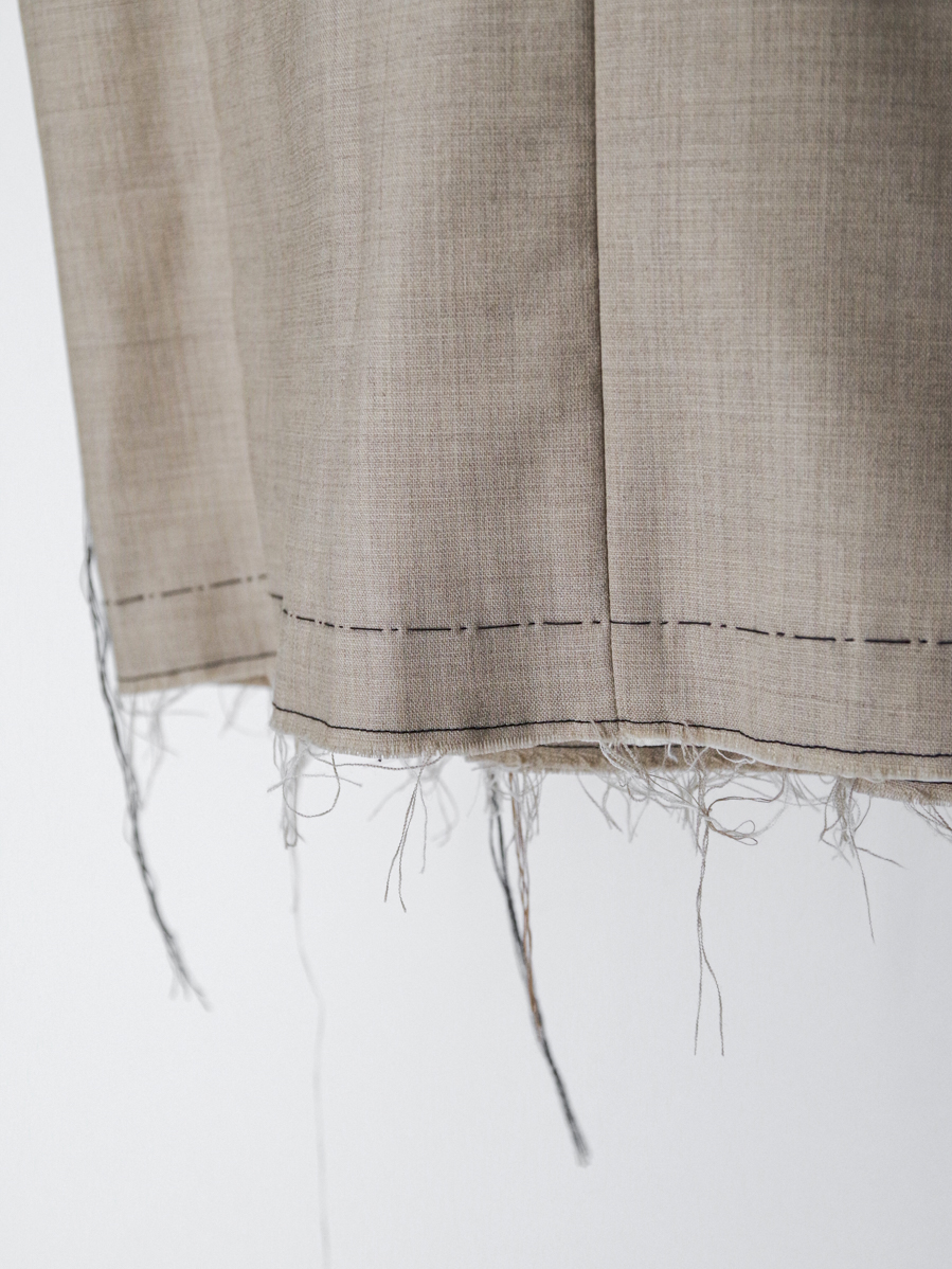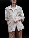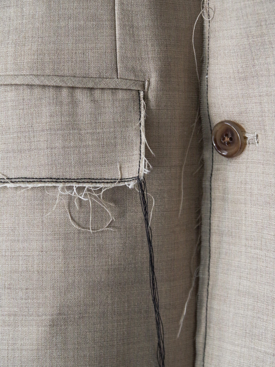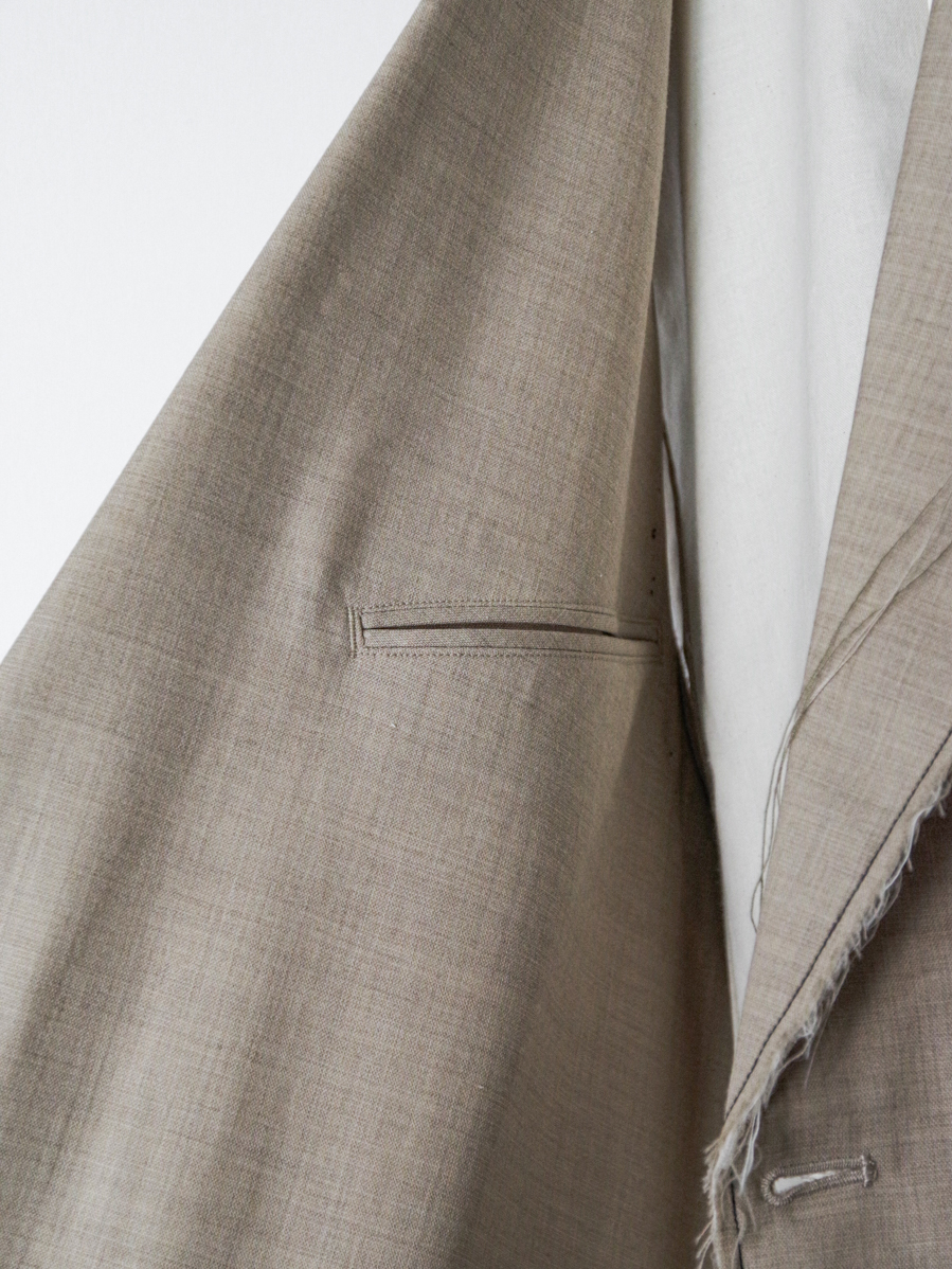 生地端を裁ち切りにしたディテールが印象的で、クラシックなテーラードの雰囲気に荒々しいニュアンスを加えたデザイン。整った佇まいの中に退廃的なムードを忍ばせることで、ファッション性を高めた一着に仕上がっています。