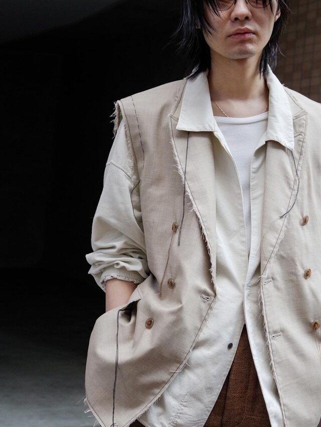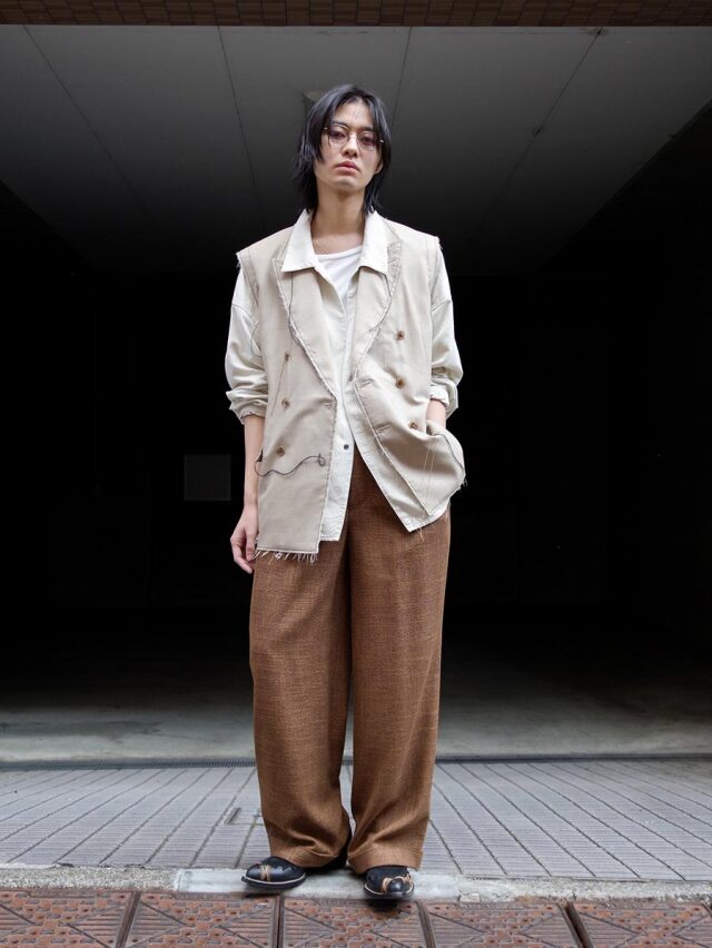 The double-breasted front maintains a balanced silhouette even when worn open. It can be layered with cut-and-sew tops or shirts, or worn over knitwear or jackets, encouraging styling that goes beyond conventional rules.