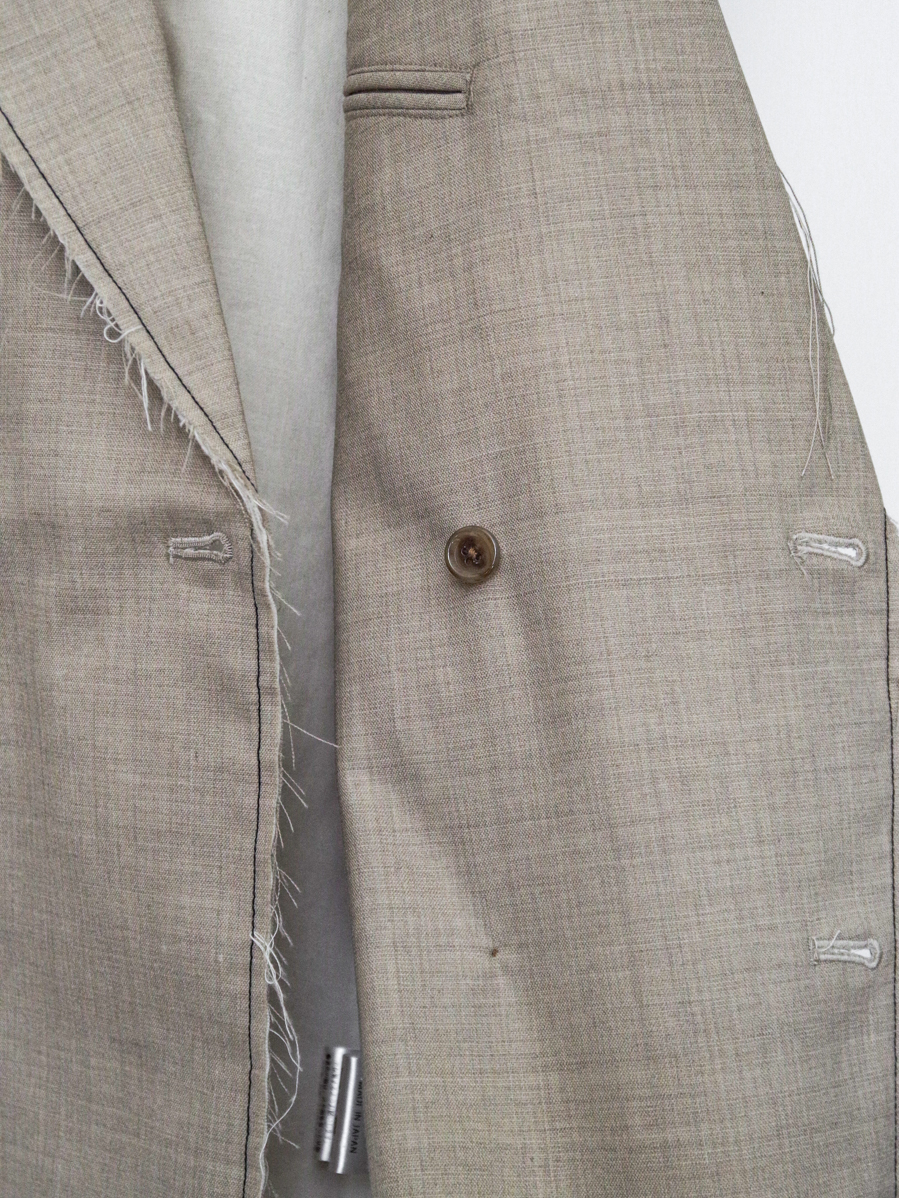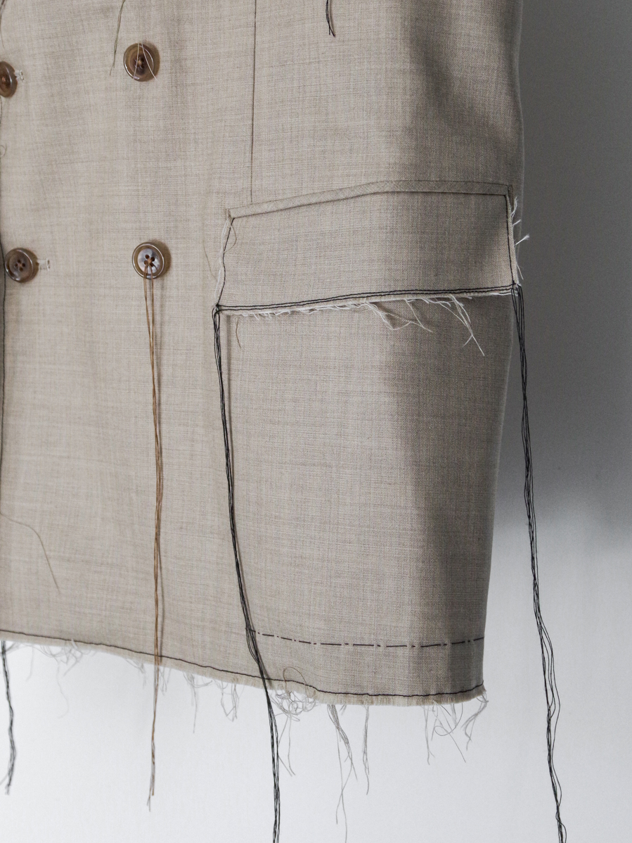 The raw-cut edges create a striking detail, introducing a rough, deconstructed nuance to an otherwise classic tailored form. This contrast between refinement and subtle decay gives the piece a distinctive fashion-forward character.