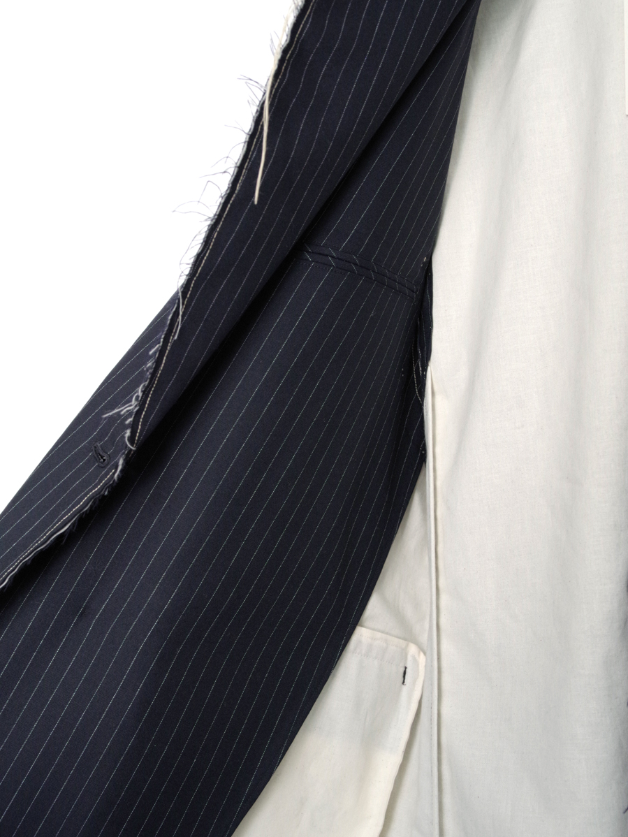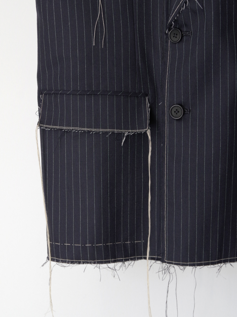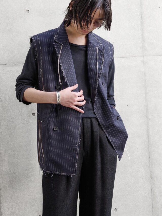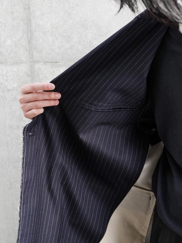 生地端を裁ち切りにしたディテールが印象的で、クラシックなテーラードの雰囲気に荒々しいニュアンスを加えたデザイン。整った佇まいの中に退廃的なムードを忍ばせることで、ファッション性を高めた一着に仕上がっています。