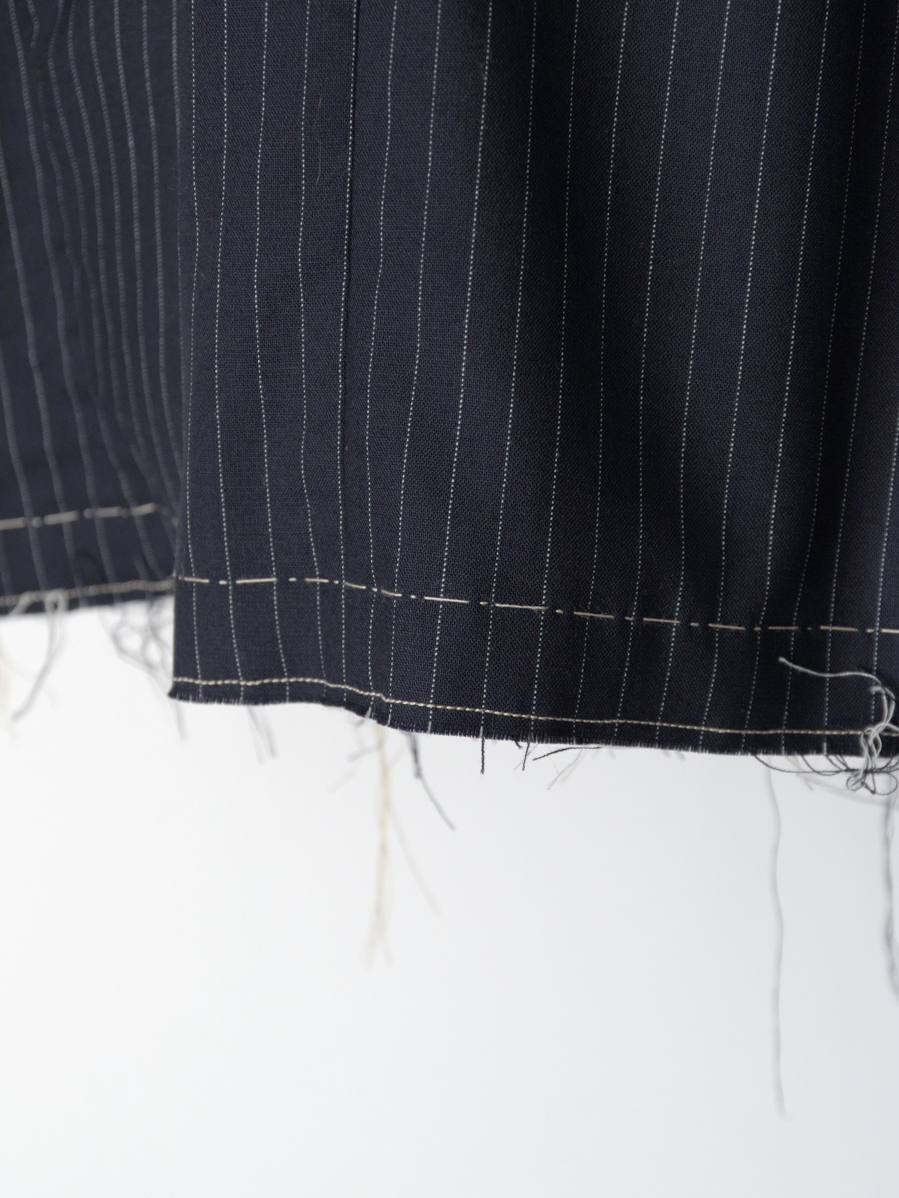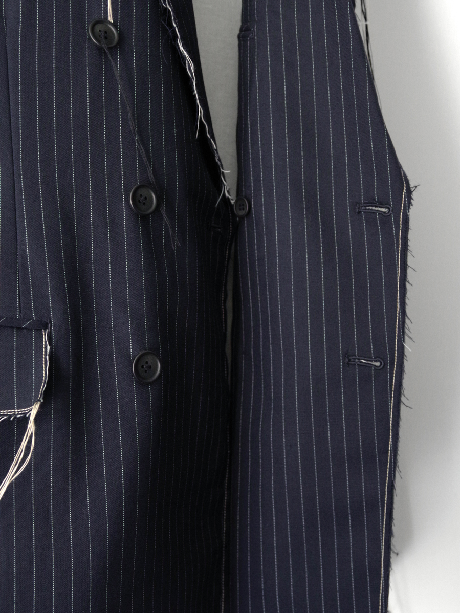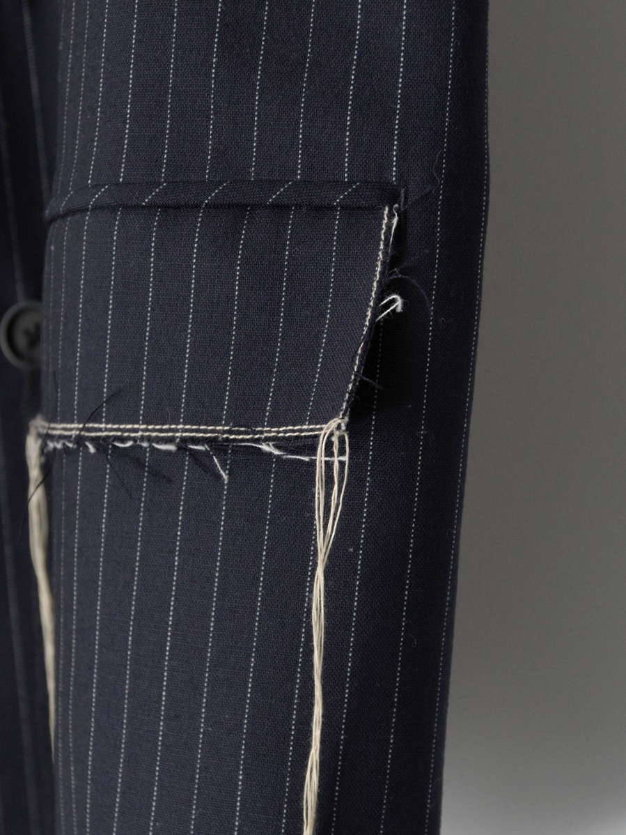 生地端を裁ち切りにしたディテールが印象的で、クラシックなテーラードの雰囲気に荒々しいニュアンスを加えたデザイン。整った佇まいの中に退廃的なムードを忍ばせることで、ファッション性を高めた一着に仕上がっています。