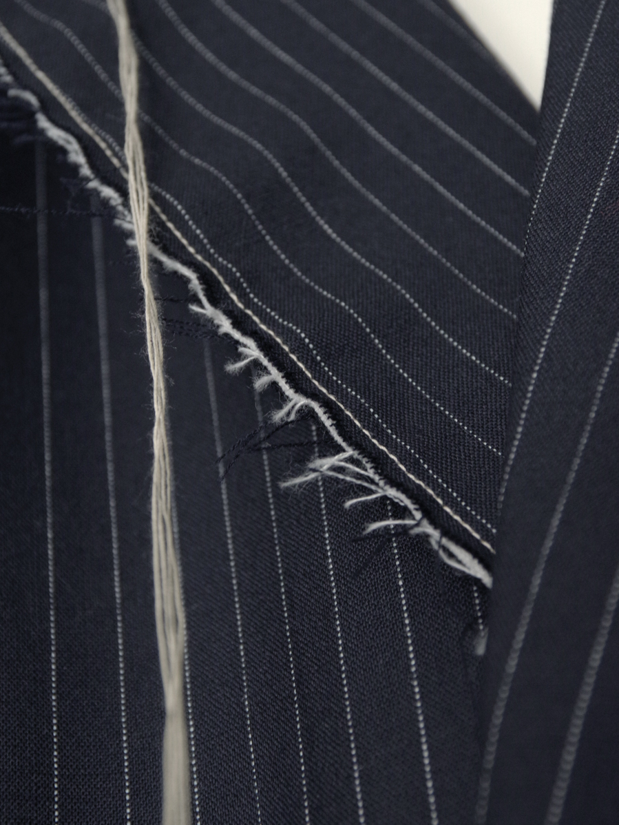 The raw-cut edges create a striking detail, introducing a rough, deconstructed nuance to an otherwise classic tailored form. This contrast between refinement and subtle decay gives the piece a distinctive fashion-forward character.