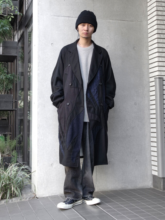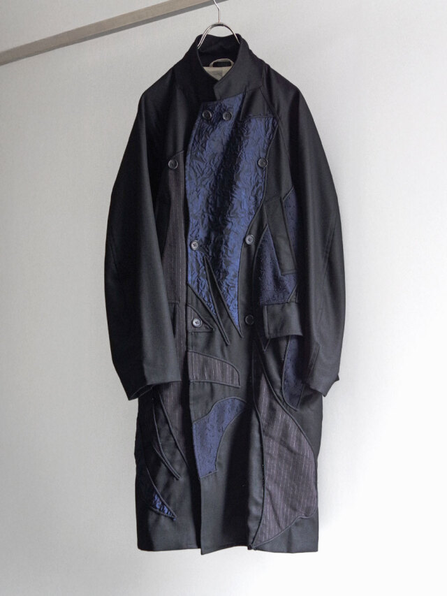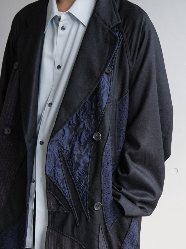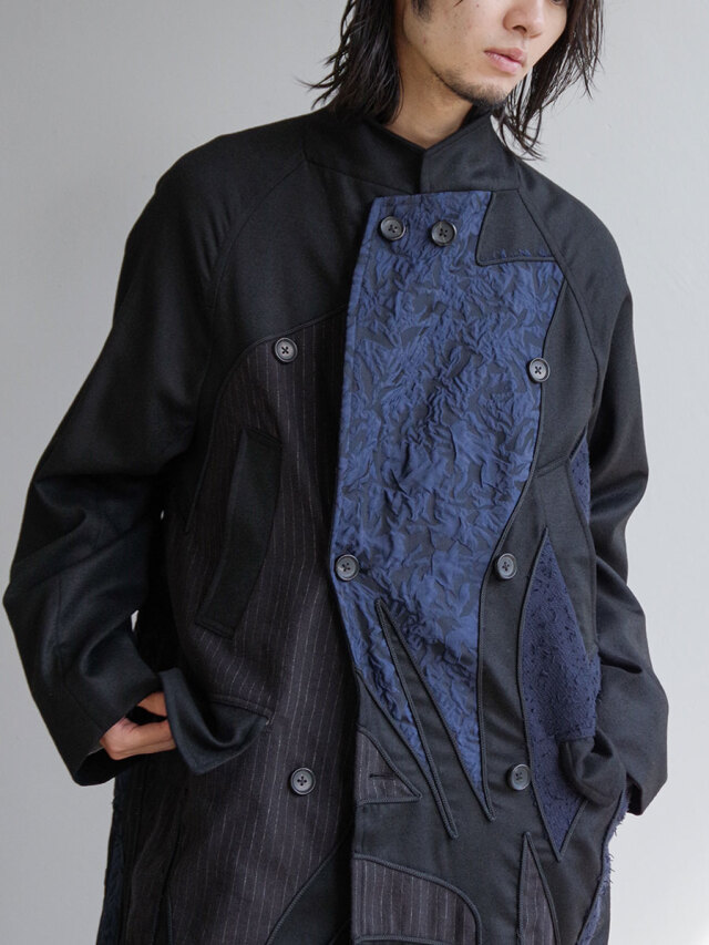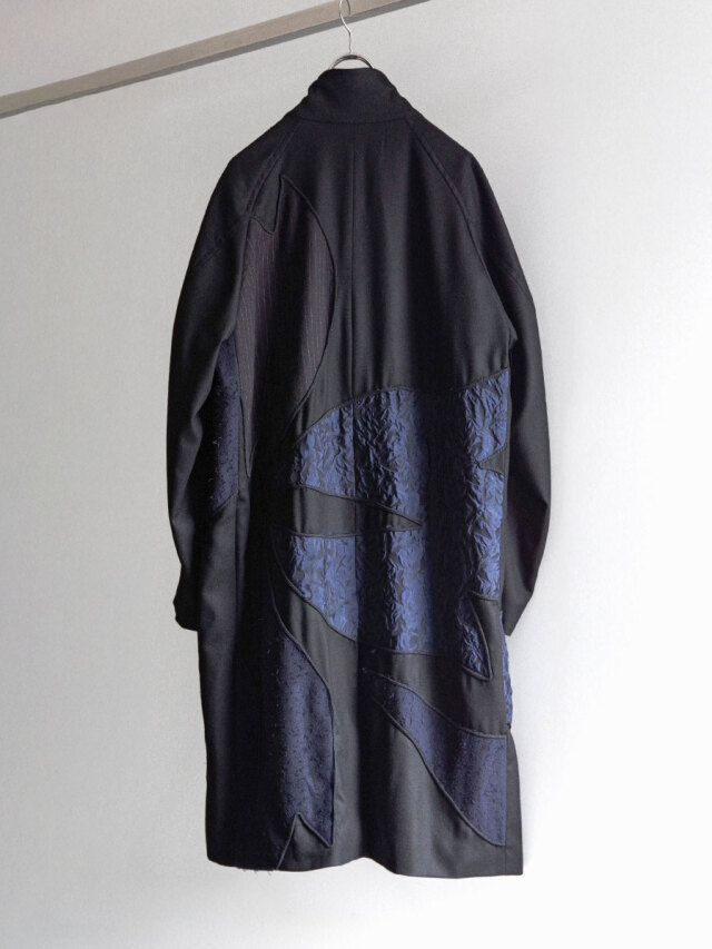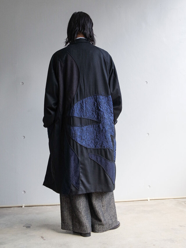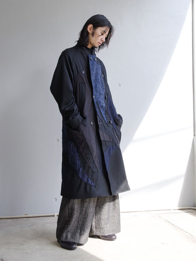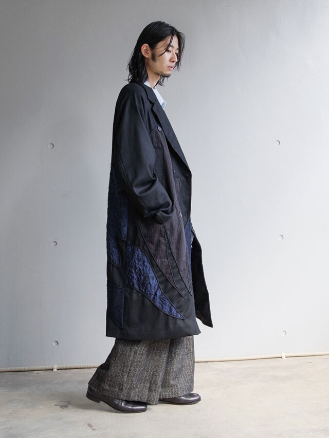 ベースとなったのは、50年代イギリス軍のダブルブレスト・グレートコート。本来のディテールを一度削ぎ落とし、ミニマルな佇まいへと再構築した上で、EMAMらしい遊び心のあるデザインディテールを随所に追加しています。全体には、多種類の素材を組み合わせた手仕事感溢れるパッチワークを配置。さらに縁取り部分にコードを叩きつけることで立体感を強調し、重厚感とクラフト感を兼ね備えた唯一無二の仕上がりとなっています。