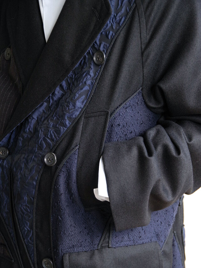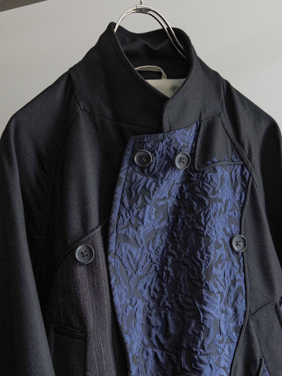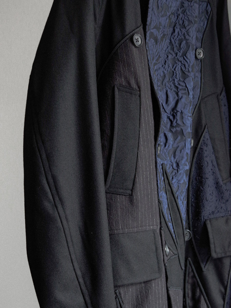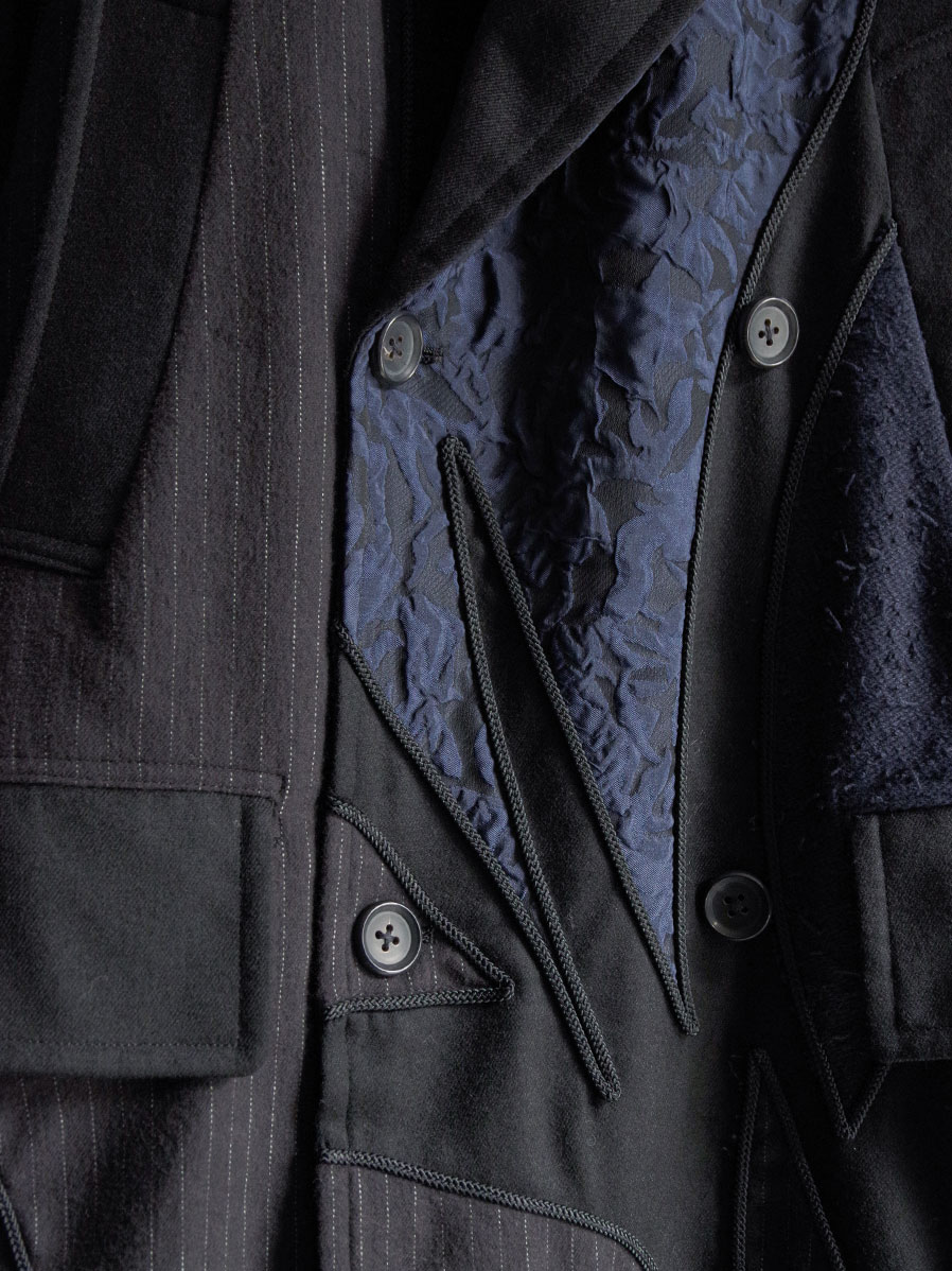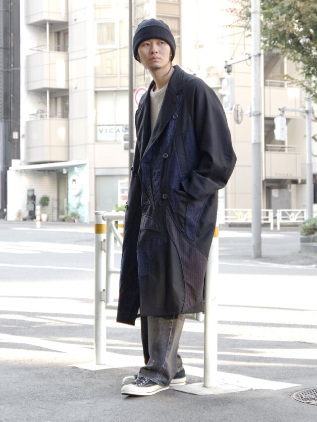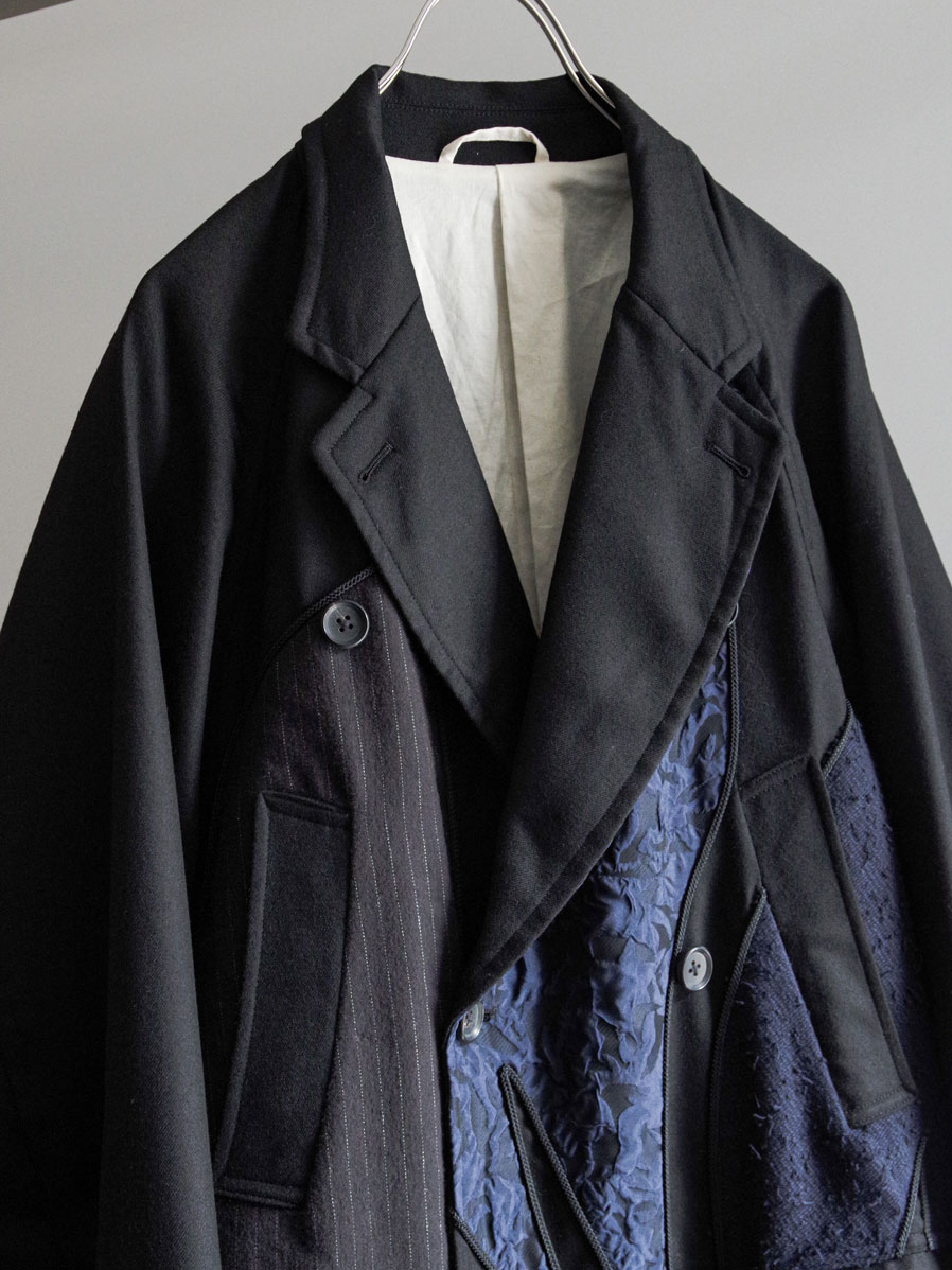 ベースとなったのは、50年代イギリス軍のダブルブレスト・グレートコート。本来のディテールを一度削ぎ落とし、ミニマルな佇まいへと再構築した上で、EMAMらしい遊び心のあるデザインディテールを随所に追加しています。全体には、多種類の素材を組み合わせた手仕事感溢れるパッチワークを配置。さらに縁取り部分にコードを叩きつけることで立体感を強調し、重厚感とクラフト感を兼ね備えた唯一無二の仕上がりとなっています。
