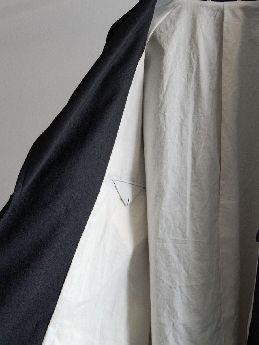 シルエットは体を優しく包み込みながらも、大きく見せない絶妙なバランスで構築されており、着用する人のスタイルを美しく引き立てます。襟はスタンドカラーとしてもアレンジ可能で、クラシックとモダンを自在に行き来するデザインに。圧倒的な存在感を放ち、作品性の高さが際立つスペシャルなコートです。