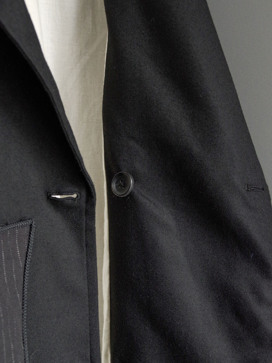 This long coat is crafted from fine wool flannel, woven at a high density to provide both firmness and a smooth, elegant surface. The fabric conveys a sense of refinement while delivering the depth and weight expected from autumn and winter outerwear.