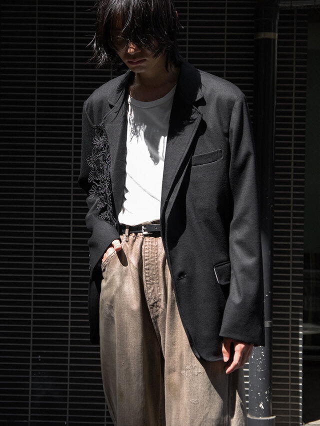 同素材のボトムスと合わせれば、他にはない独創的なセットアップスタイルが完成し、特別な場面でも輝きを放ちます。単体でも十分な存在感を持ちながら、トータルでの着こなしではより強い個性を際立たせる、唯一無二の表現力を備えたジャケットです。