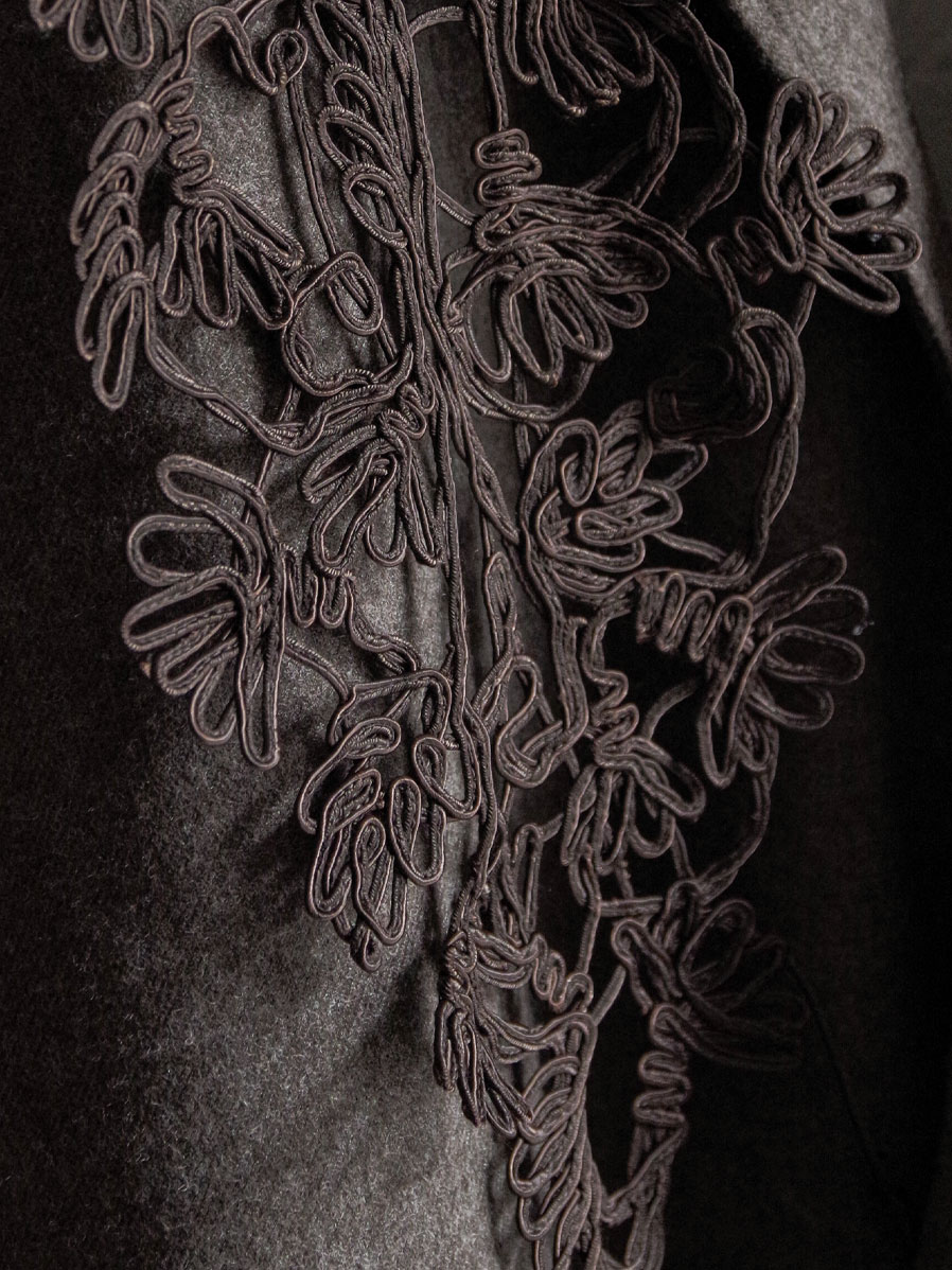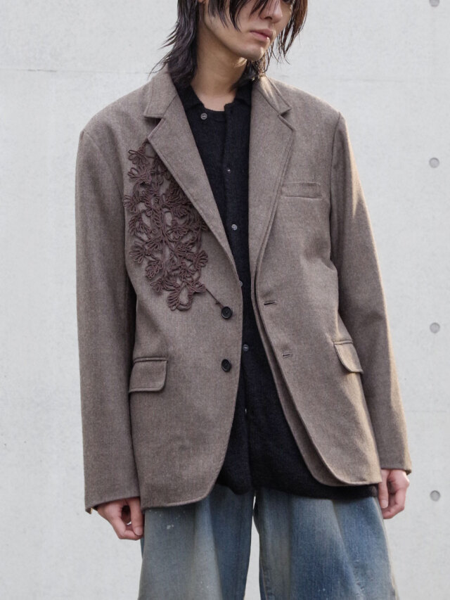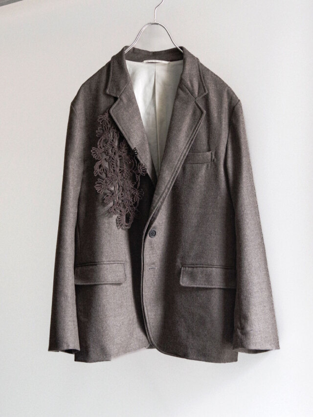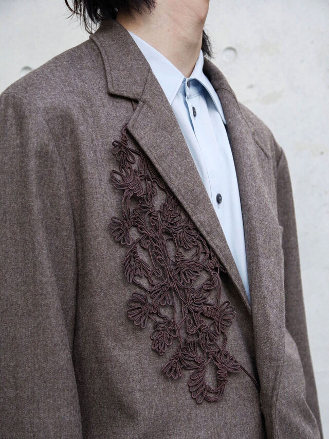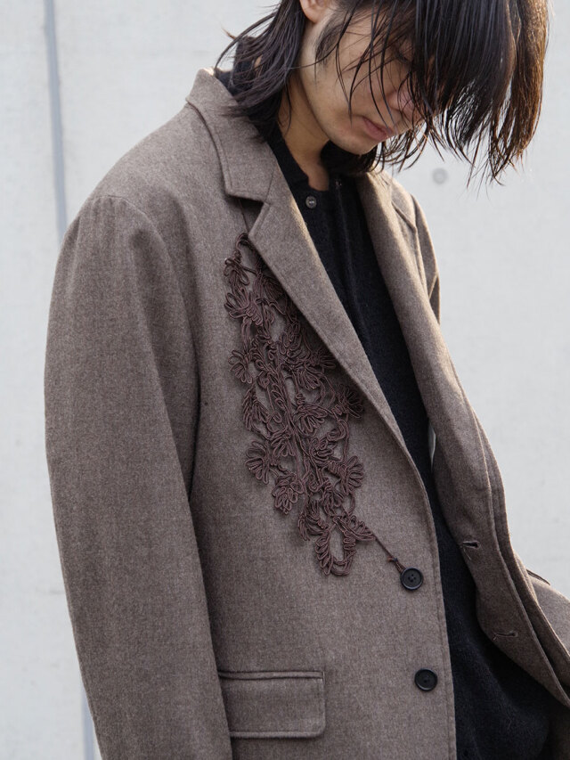 On the right chest, an original lace part crafted from cord adds an elegant and eye-catching detail. Since it is removable, the wearer can adjust the styling from bold and decorative to understated and refined as the occasion demands.