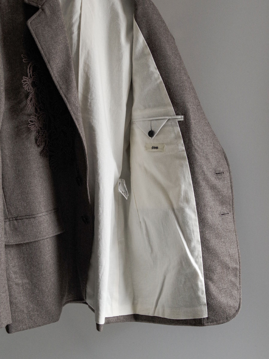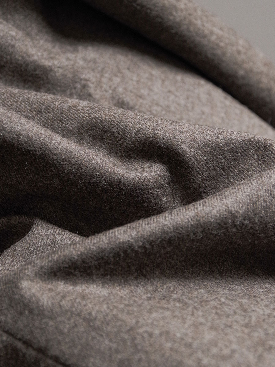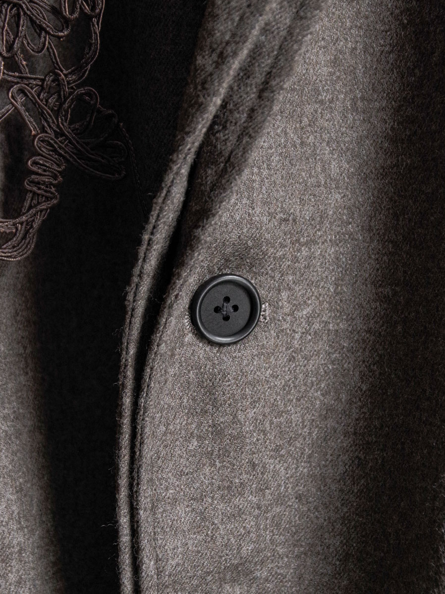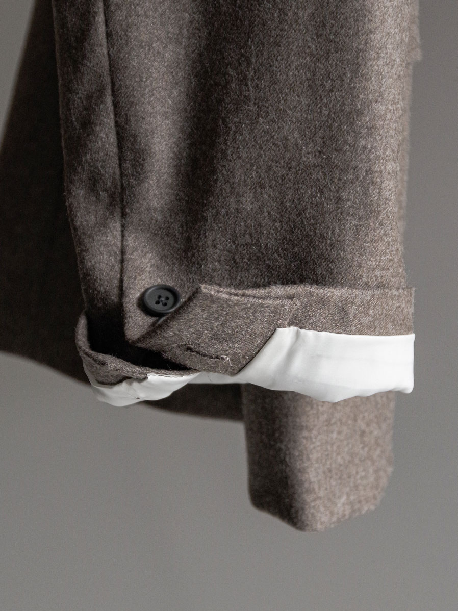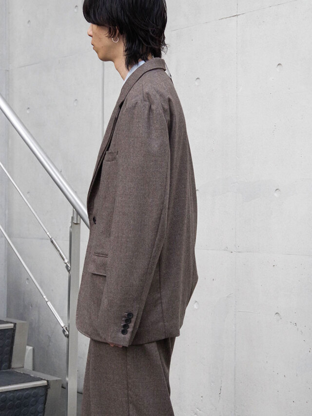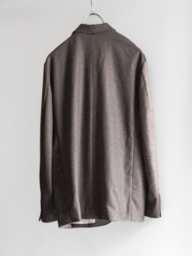 This jacket is crafted from fine, high-quality wool yarn woven into a dense flannel fabric, offering both firmness and a refined luster. Its smooth surface and depth of texture give it a versatile character that moves seamlessly between formal and contemporary styles.