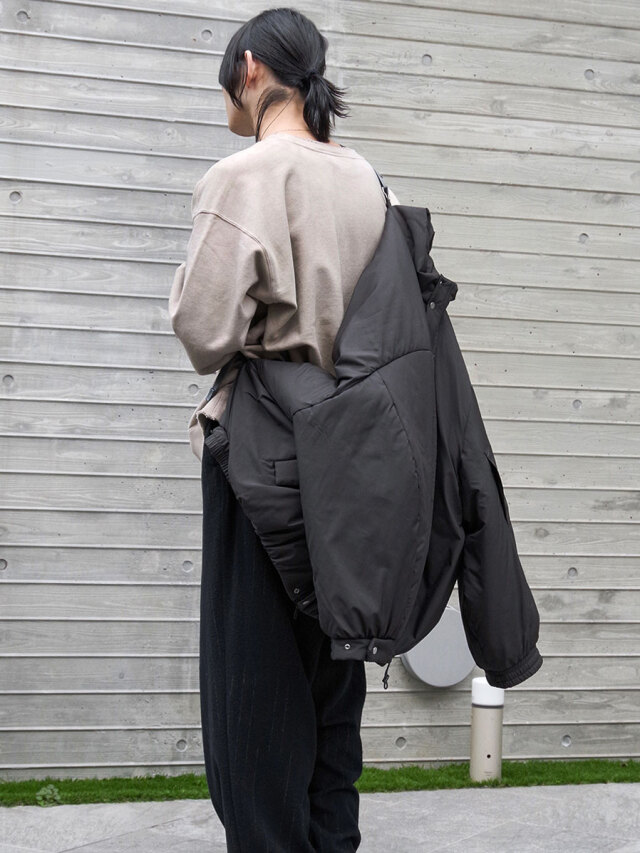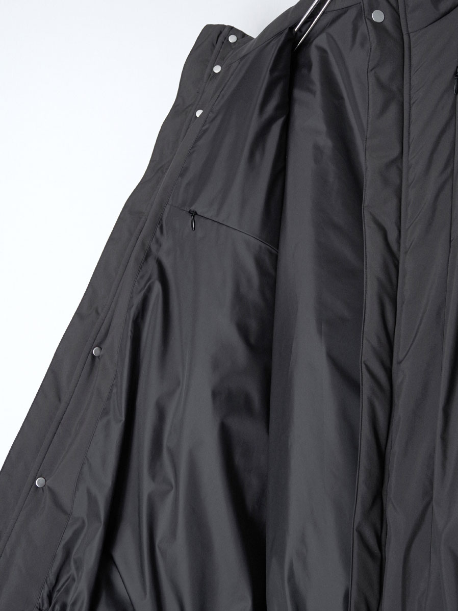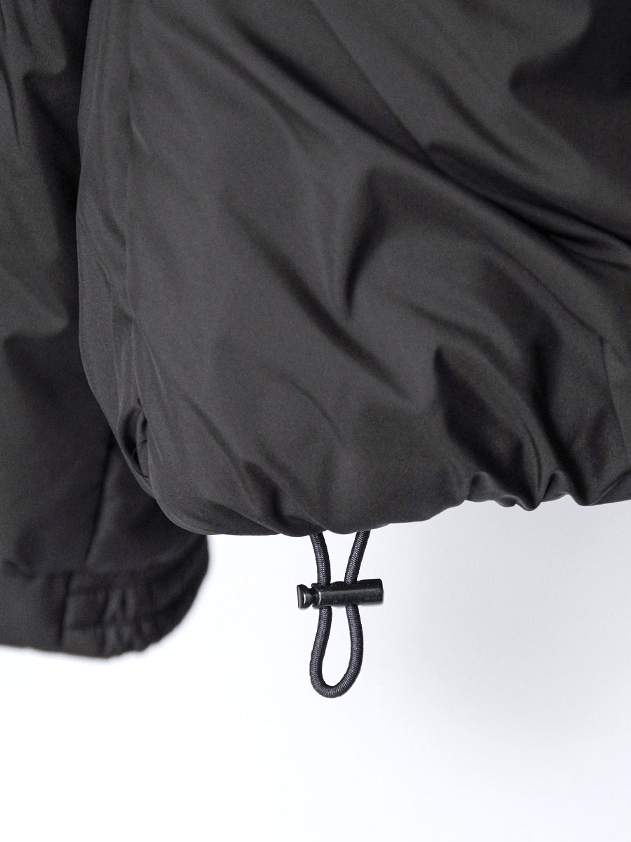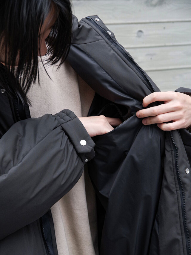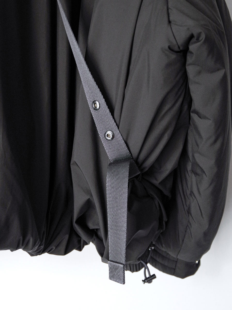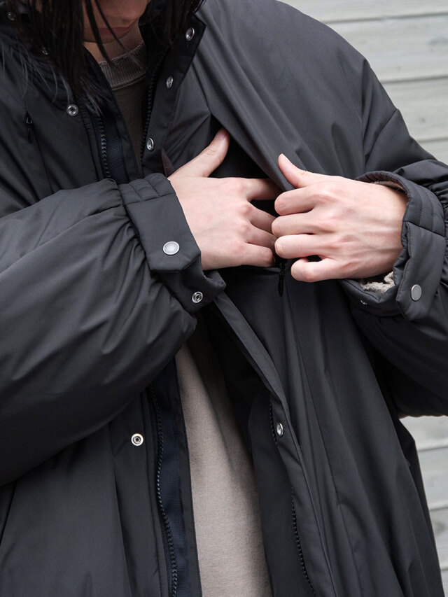 By adjusting the fill weight for each section in gram-level detail, the silhouette remains sleek and structured. Ten strategically placed pockets, including four on the sleeves, provide both functionality and visual complexity. A drawcord hem allows for silhouette adjustments while blocking out cold air, and a sling strap on the back lets the wearer carry it over the shoulder when removed.