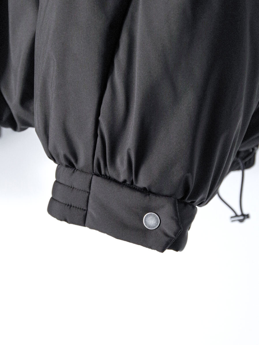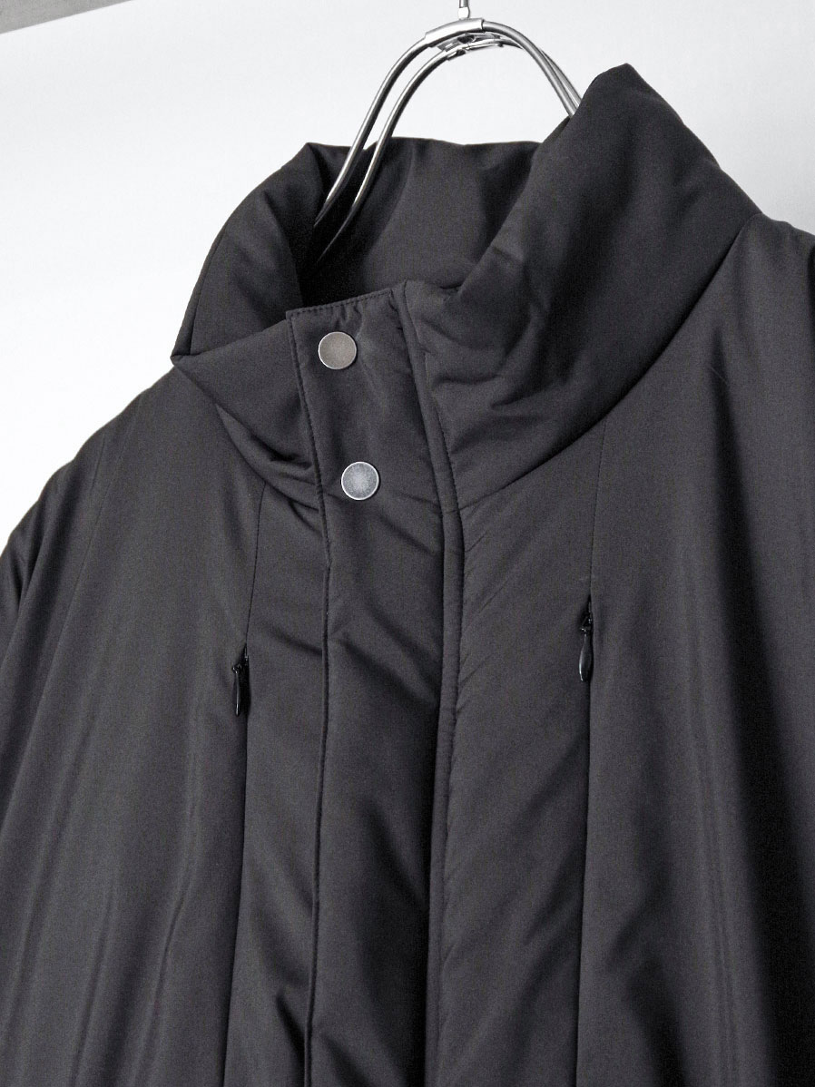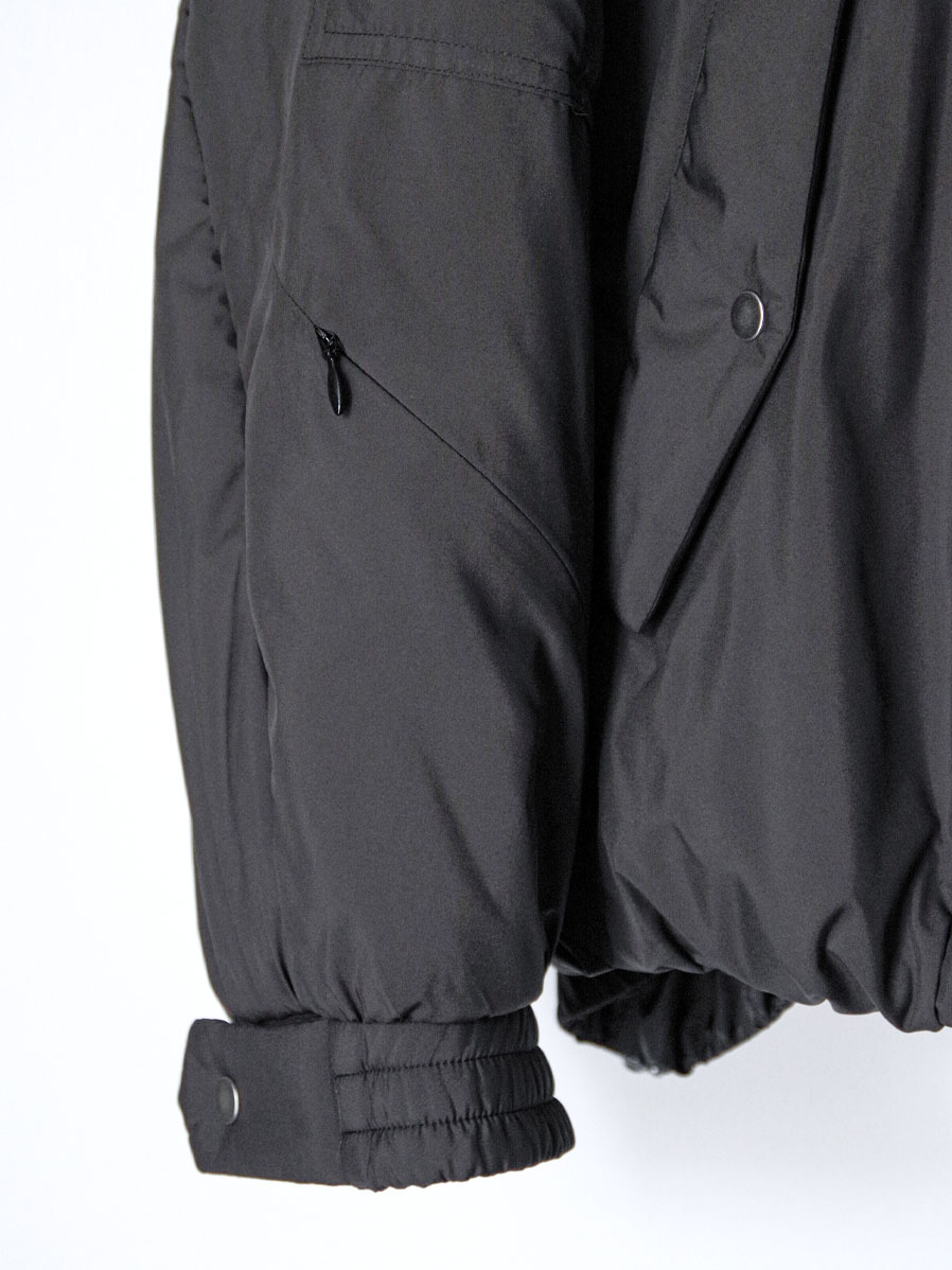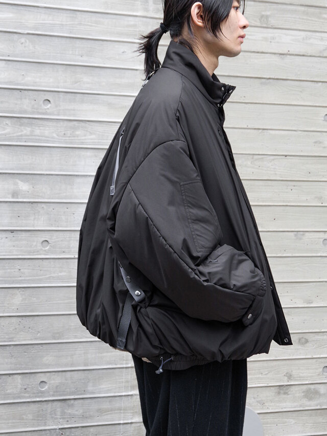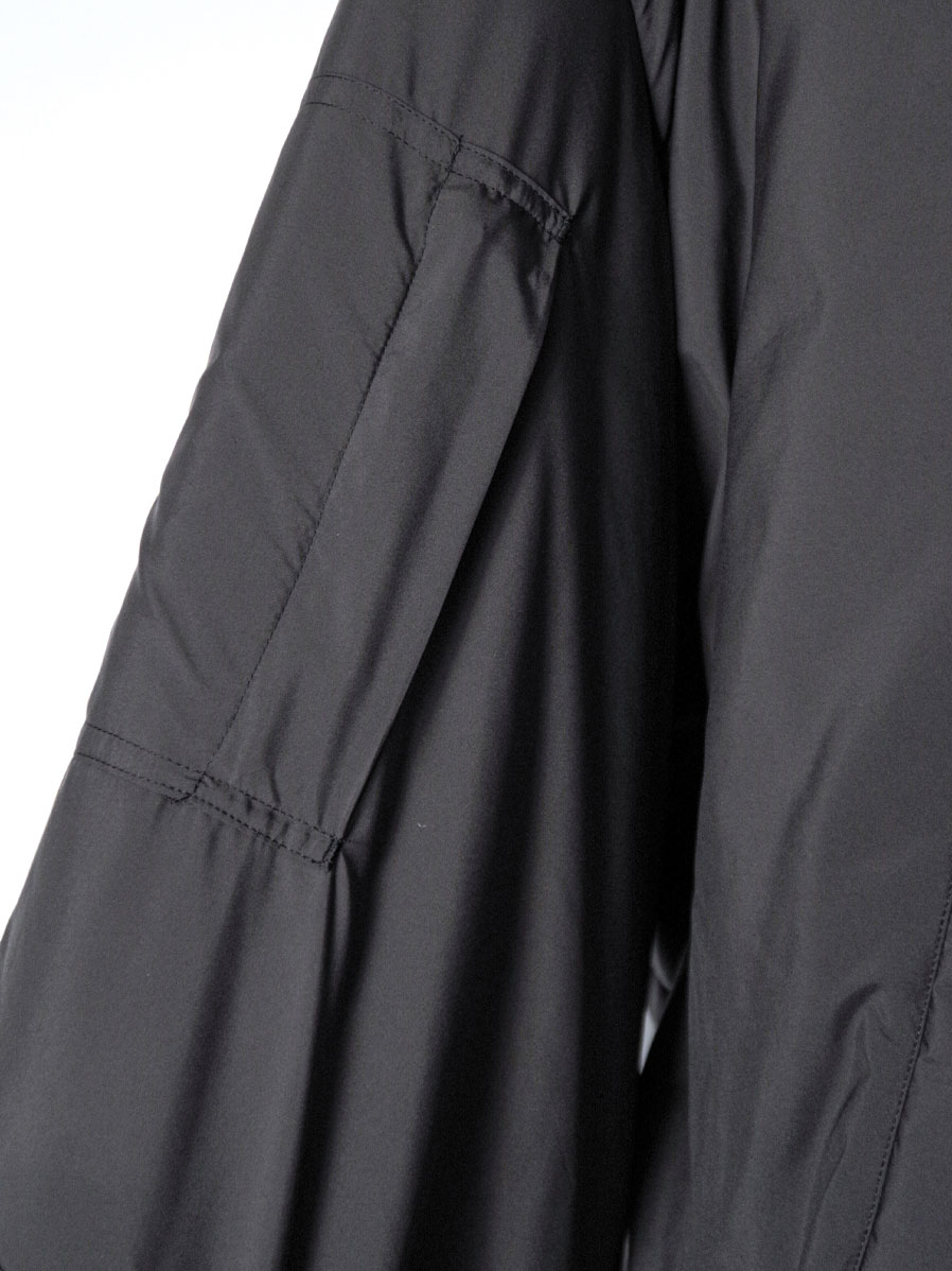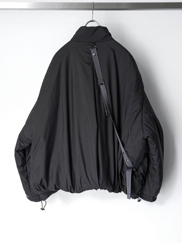 By adjusting the fill weight for each section in gram-level detail, the silhouette remains sleek and structured. Ten strategically placed pockets, including four on the sleeves, provide both functionality and visual complexity. A drawcord hem allows for silhouette adjustments while blocking out cold air, and a sling strap on the back lets the wearer carry it over the shoulder when removed.