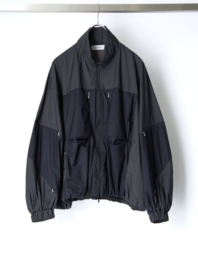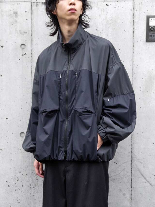 モードとスポーツを融合させたデザインが特徴のトラックジャケット。大胆なカッティングワークによる切り替えデザインで、チャコールとネイビーのパーツを巧みに組み合わせ、洗練されたモードな印象を演出しています。