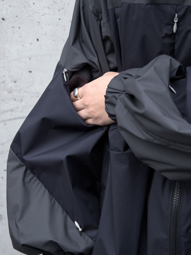 シルエットは立体感のあるバルーンシルエット。裾のドローコードを調整することで、シルエットに変化をつけて着こなしを楽しめる一着です。都会的でありながらスポーティなムードを纏うハイブリッドジャケットです。